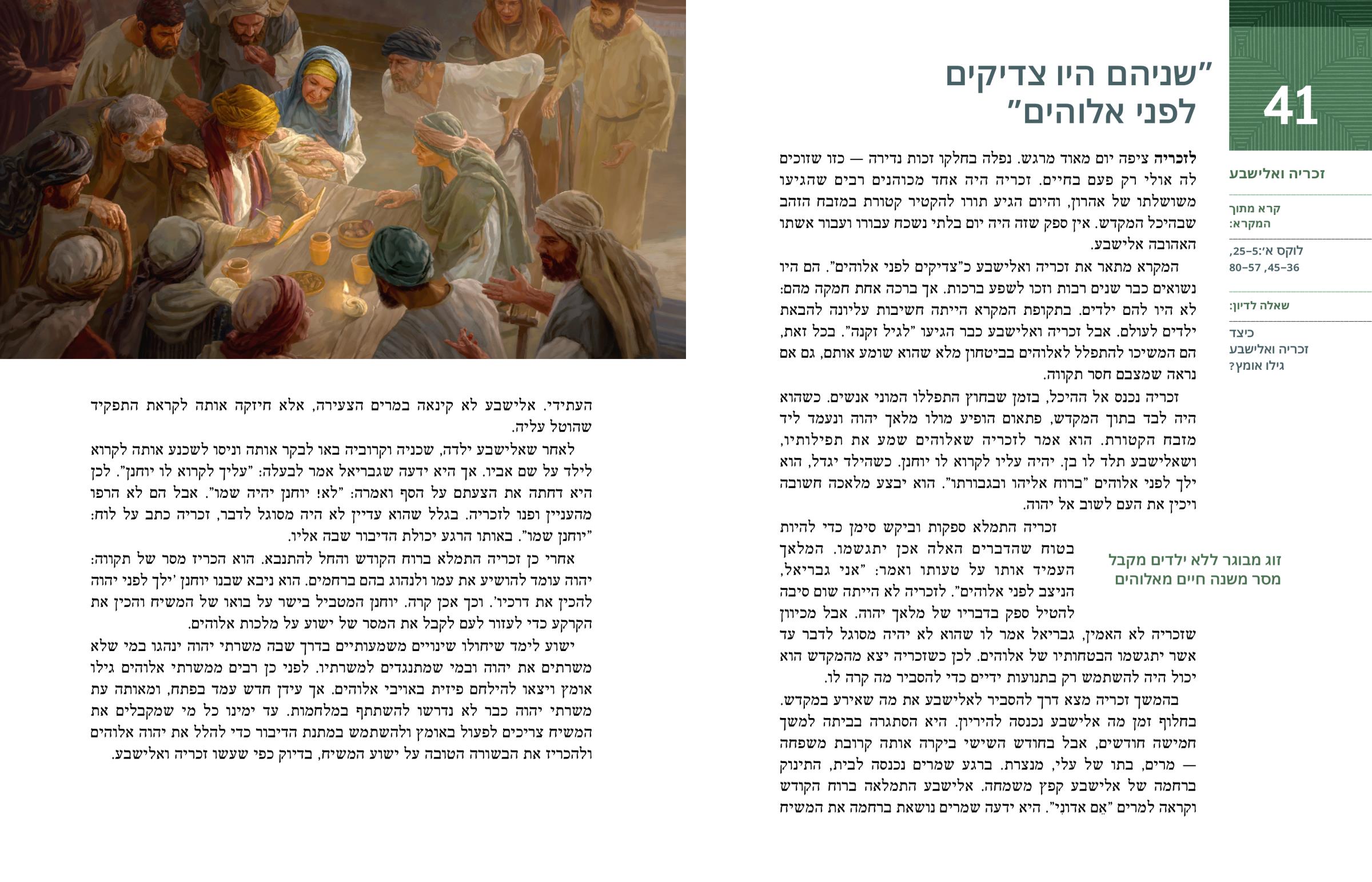 המקרא מתאר את זכריה ואלישבע כ”צדיקים לפני אלוהים”. הם היו נשואים כבר שנים רבות וזכו לשפע ברכות. אך ברכה אחת חמקה מהם: לא היו להם ילדים. בתקופת המקרא הייתה חשיבות עליונה להבאת ילדים לעולם. אבל זכריה ואלישבע כבר הגיעו ”לגיל זקנה”. בכל זאת, הם המשיכו להתפלל לאלוהים בביטחון מלא שהוא שומע אותם, גם אם נראה שמצבם חסר תקווה.