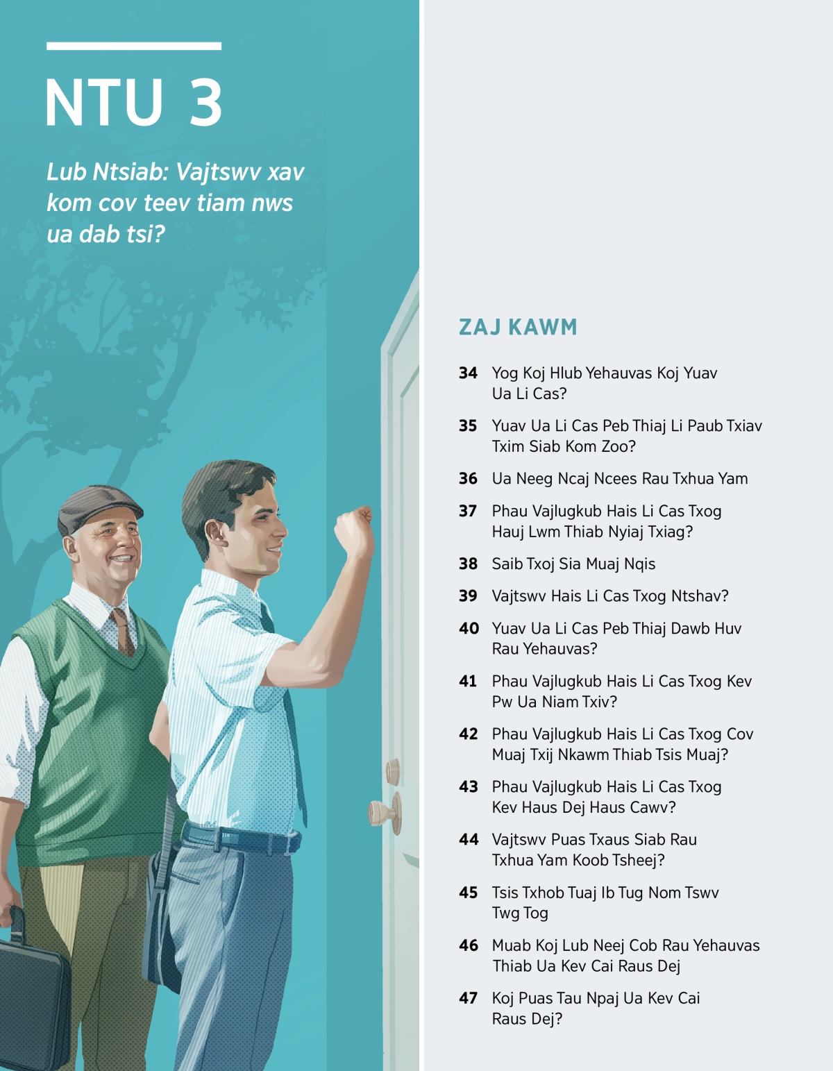 Ntu 3 Zoo Yam Phau Ntawv Lub Ntsiab: Vajtswv xav kom cov teev tiam nws ua dab tsi? ZAJ KAWM 34 Yog Koj Hlub Yehauvas Koj Yuav Ua Li Cas? 35 Yuav Ua Li Cas Peb Thiaj Li Paub Txiav Txim Siab Kom Zoo? 36 Ua Neeg Ncaj Ncees Rau Txhua Yam 37 Phau Vajlugkub Hais Li Cas Txog Hauj Lwm Thiab Nyiaj Txiag? 38 Saib Txoj Sia Muaj Nqis 39 Vajtswv Hais Li Cas Txog Ntshav? 40 Yuav Ua Li Cas Peb Thiaj Dawb Huv Rau Yehauvas? 41 Phau Vajlugkub Hais Li Cas Txog Kev Pw Ua Niam Txiv? 42 Phau Vajlugkub Hais Li Cas Txog Cov Muaj Txij Nkawm Thiab Tsis Muaj? 43 Phau Vajlugkub Hais Li Cas Txog Kev Haus Dej Haus Cawv? 44 Vajtswv Puas Txaus Siab Rau Txhua Yam Koob Tsheej? 45 Tsis Txhob Tuaj Ib Tug Nom Tswv Twg Tog 46 Muab Koj Lub Neej Cob Rau Yehauvas Thiab Ua Kev Cai Raus Dej 47 Koj Puas Tau Npaj Ua Kev Cai Raus Dej?