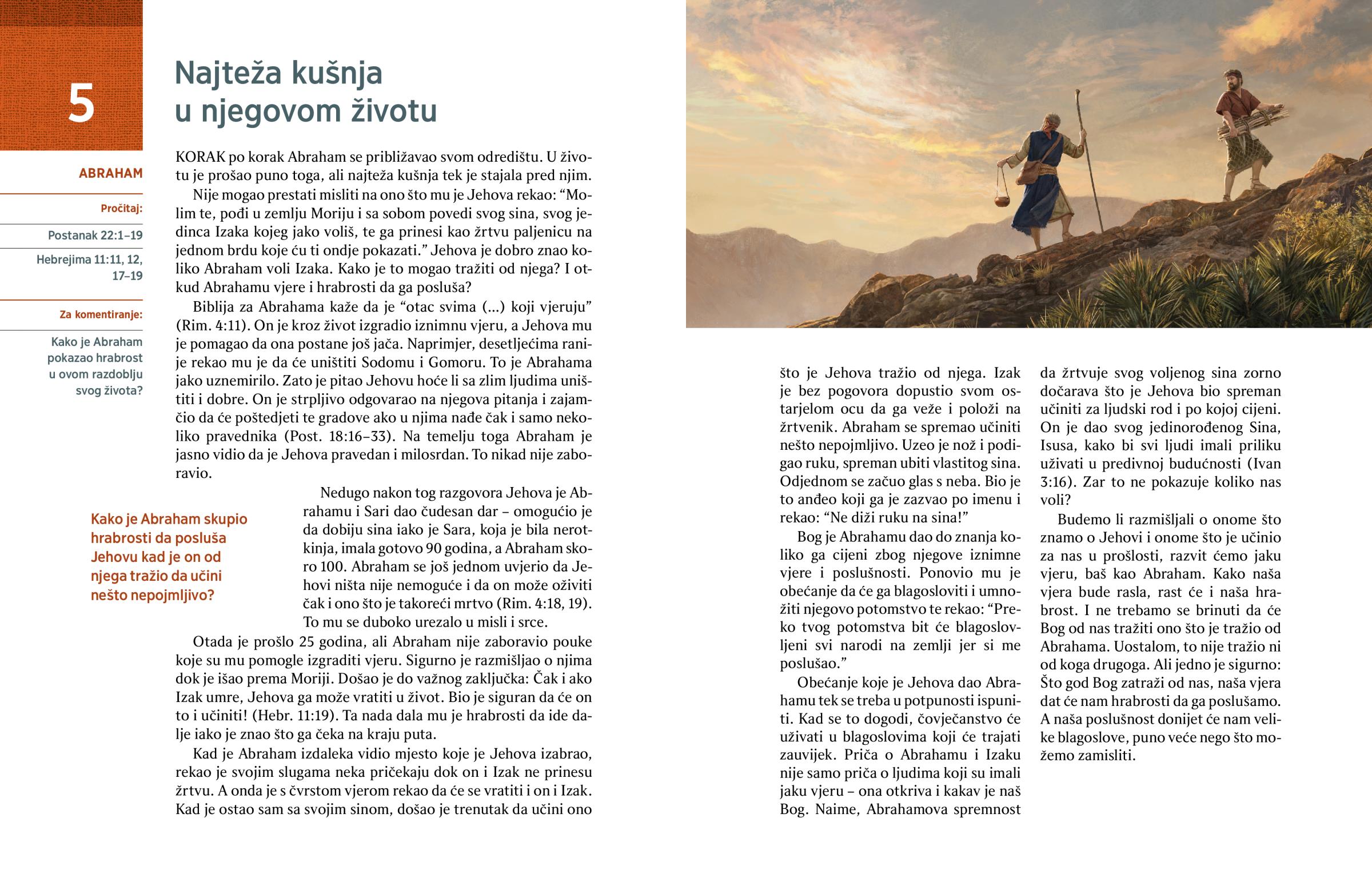 Nije mogao prestati misliti na ono što mu je Jehova rekao: “Molim te, pođi u zemlju Moriju i sa sobom povedi svog sina, svog jedinca Izaka kojeg jako voliš, te ga prinesi kao žrtvu paljenicu na jednom brdu koje ću ti ondje pokazati.” Jehova je dobro znao koliko Abraham voli Izaka. Kako je to mogao tražiti od njega? I otkud Abrahamu vjere i hrabrosti da ga posluša?