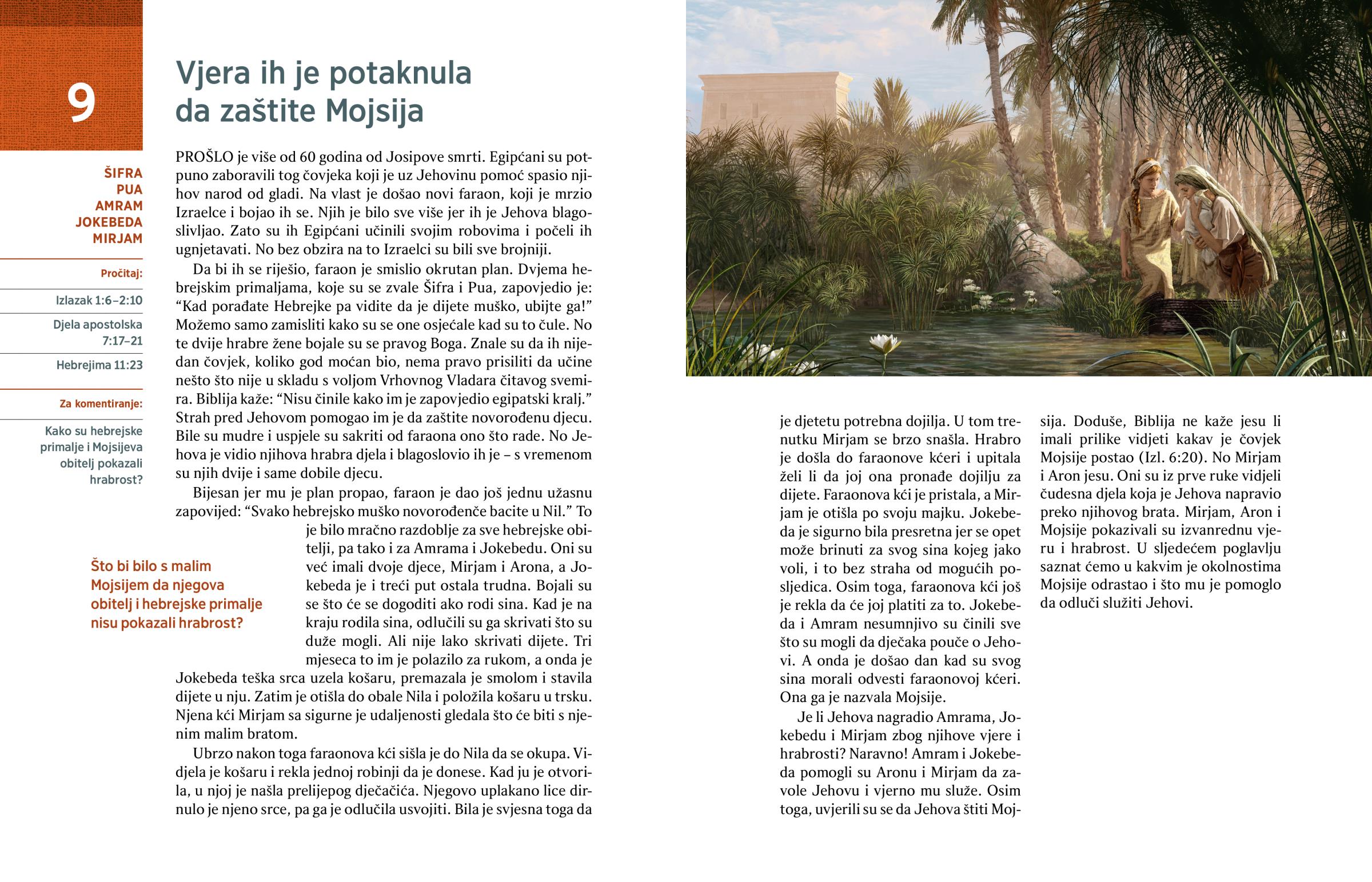 Je li Jehova nagradio Amrama, Jokebedu i Mirjam zbog njihove vjere i hrabrosti? Naravno! Amram i Jokebeda pomogli su Aronu i Mirjam da zavole Jehovu i vjerno mu služe. Osim toga, uvjerili su se da Jehova štiti Mojsija. Doduše, Biblija ne kaže jesu li imali prilike vidjeti kakav je čovjek Mojsije postao (Izl. 6:20). No Mirjam i Aron jesu. Oni su iz prve ruke vidjeli čudesna djela koja je Jehova napravio preko njihovog brata. Mirjam, Aron i Mojsije pokazivali su izvanrednu vjeru i hrabrost. U sljedećem poglavlju saznat ćemo u kakvim je okolnostima Mojsije odrastao i što mu je pomoglo da odluči služiti Jehovi.