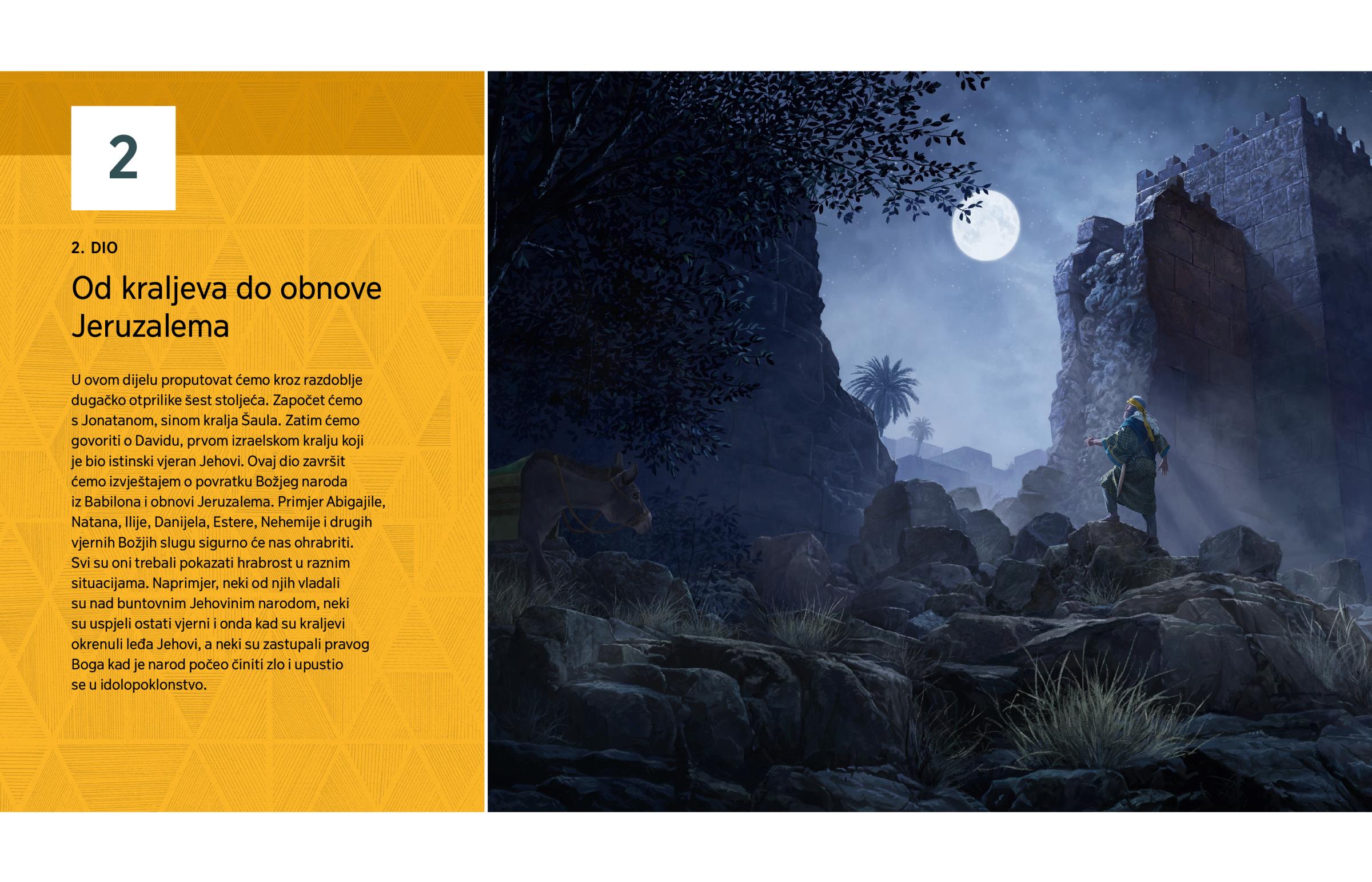 U ovom dijelu proputovat ćemo kroz razdoblje dugačko otprilike šest stoljeća. Započet ćemo s Jonatanom, sinom kralja Šaula. Zatim ćemo govoriti o Davidu, prvom izraelskom kralju koji je bio istinski vjeran Jehovi. Ovaj dio završit ćemo izvještajem o povratku Božjeg naroda iz Babilona i obnovi Jeruzalema. Primjer Abigajile, Natana, Ilije, Danijela, Estere, Nehemije i drugih vjernih Božjih slugu sigurno će nas ohrabriti. Svi su oni trebali pokazati hrabrost u raznim situacijama. Naprimjer, neki od njih vladali su nad buntovnim Jehovinim narodom, neki su uspjeli ostati vjerni i onda kad su kraljevi okrenuli leđa Jehovi, a neki su zastupali pravog Boga kad je narod počeo činiti zlo i upustio se u idolopoklonstvo.