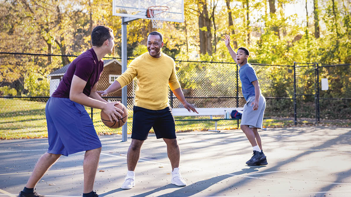 d OPIS ILUSTRACIJE: Otac se trudi upoznati prijatelje svog sina i zato igra košarku sa sinom i jednim njegovim prijateljem.