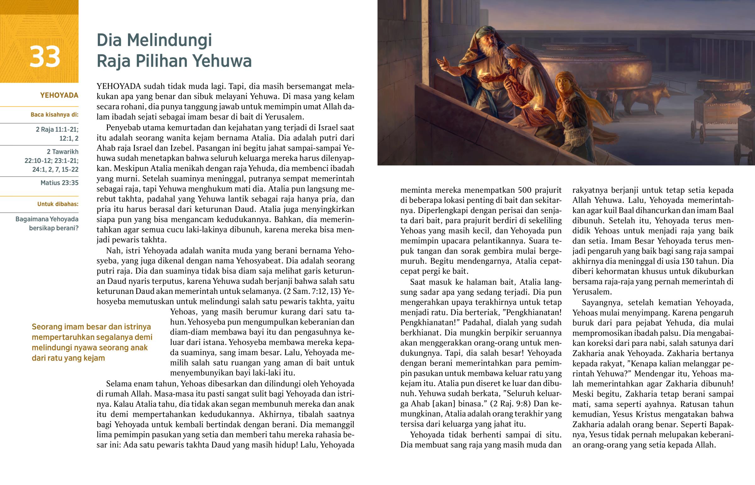 Nah, istri Yehoyada adalah wanita muda yang berani bernama Yehosyeba, yang juga dikenal dengan nama Yehosyabeat. Dia adalah seorang putri raja. Dia dan suaminya tidak bisa diam saja melihat garis keturunan Daud nyaris terputus, karena Yehuwa sudah berjanji bahwa salah satu keturunan Daud akan memerintah untuk selamanya. (2 Sam. 7:12, 13) Yehosyeba memutuskan untuk melindungi salah satu pewaris takhta, yaitu Yehoas, yang masih berumur kurang dari satu tahun. Yehosyeba pun mengumpulkan keberanian dan diam-diam membawa bayi itu dan pengasuhnya keluar dari istana. Yehosyeba membawa mereka kepada suaminya, sang imam besar. Lalu, Yehoyada memilih salah satu ruangan yang aman di bait untuk menyembunyikan bayi laki-laki itu.