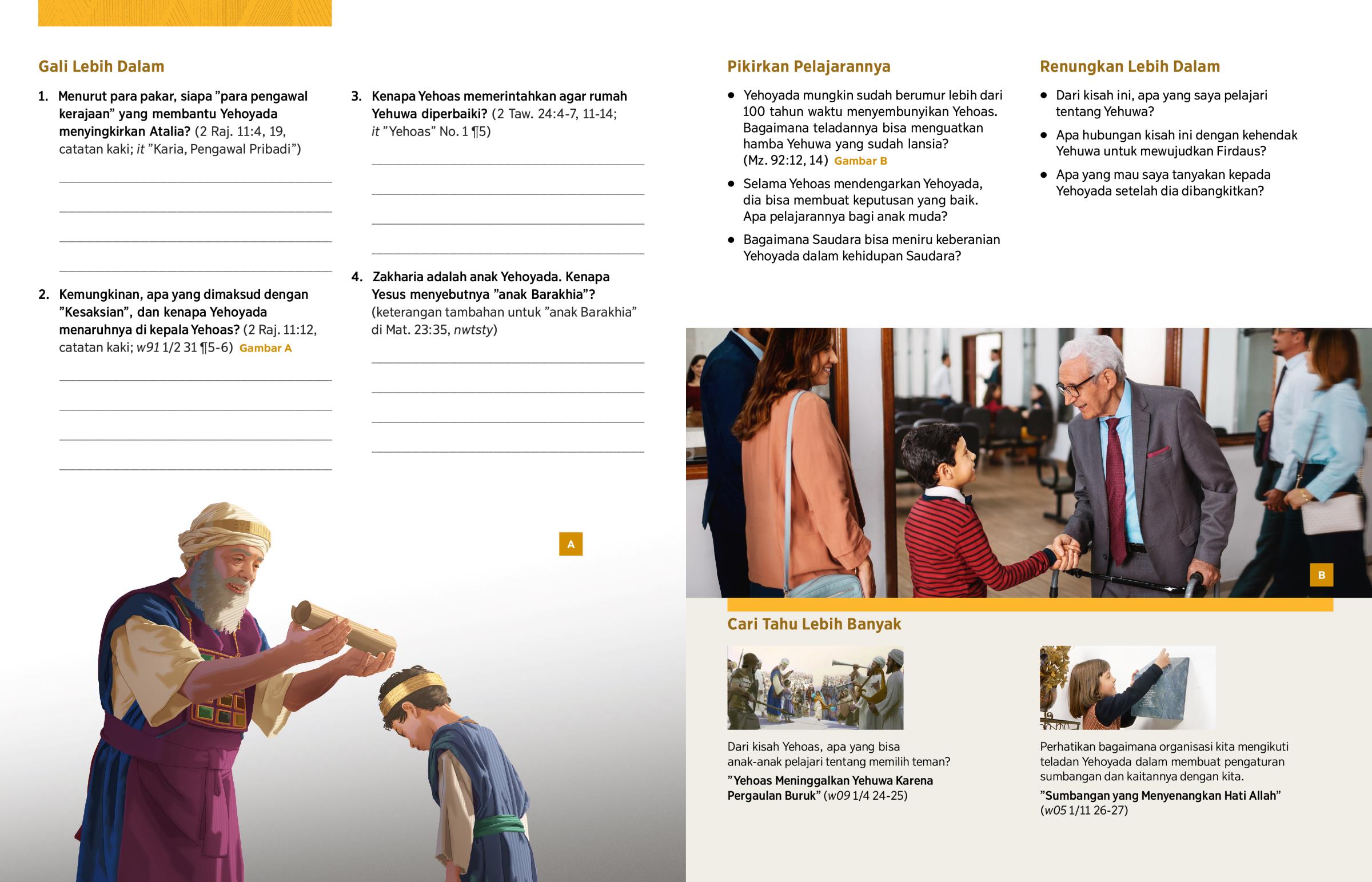 2. Kemungkinan, apa yang dimaksud dengan ”Kesaksian”, dan kenapa Yehoyada menaruhnya di kepala Yehoas? (2 Raj. 11:12, catatan kaki; w91 1/2 31 ¶5-6) Gambar A