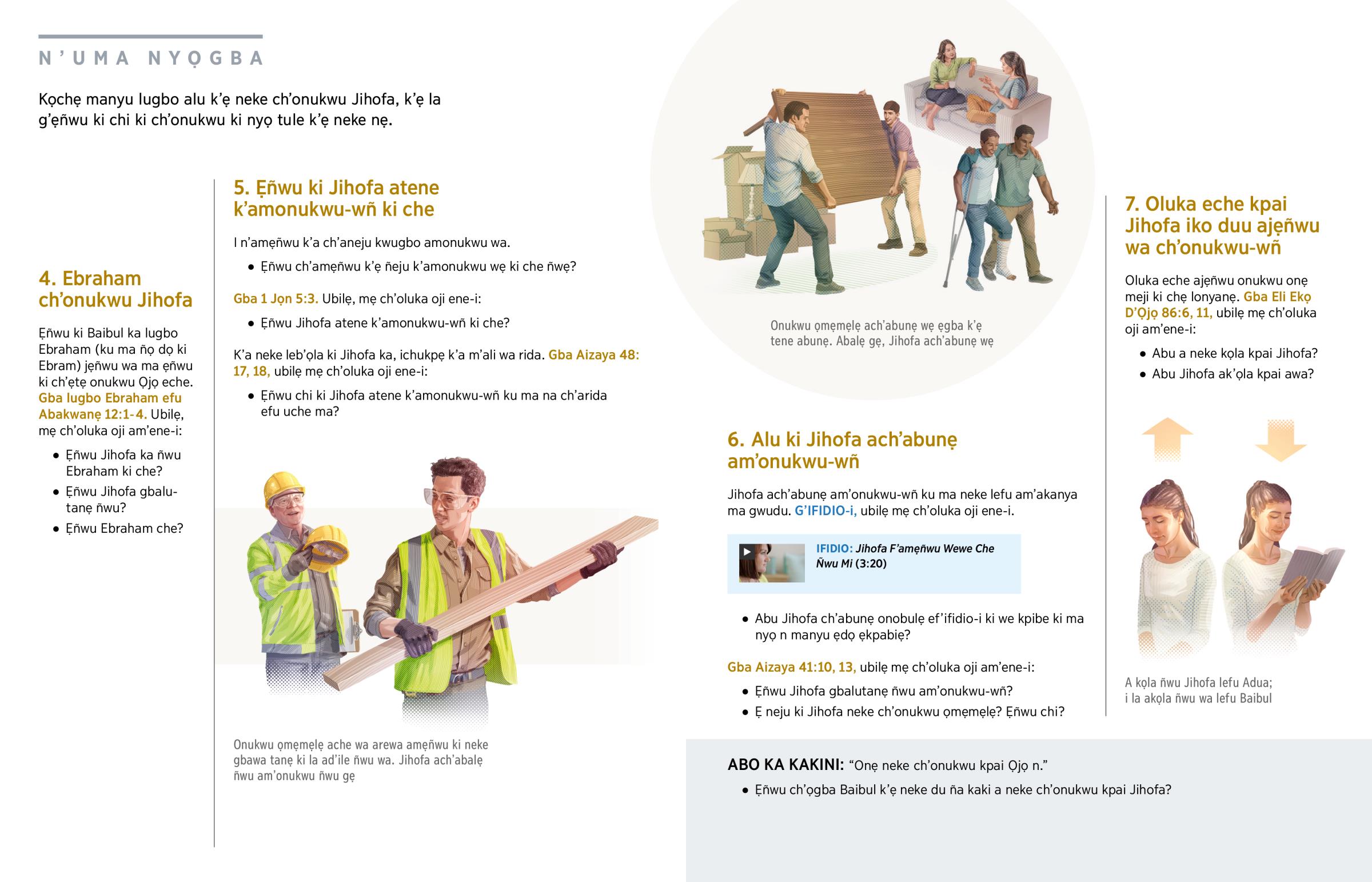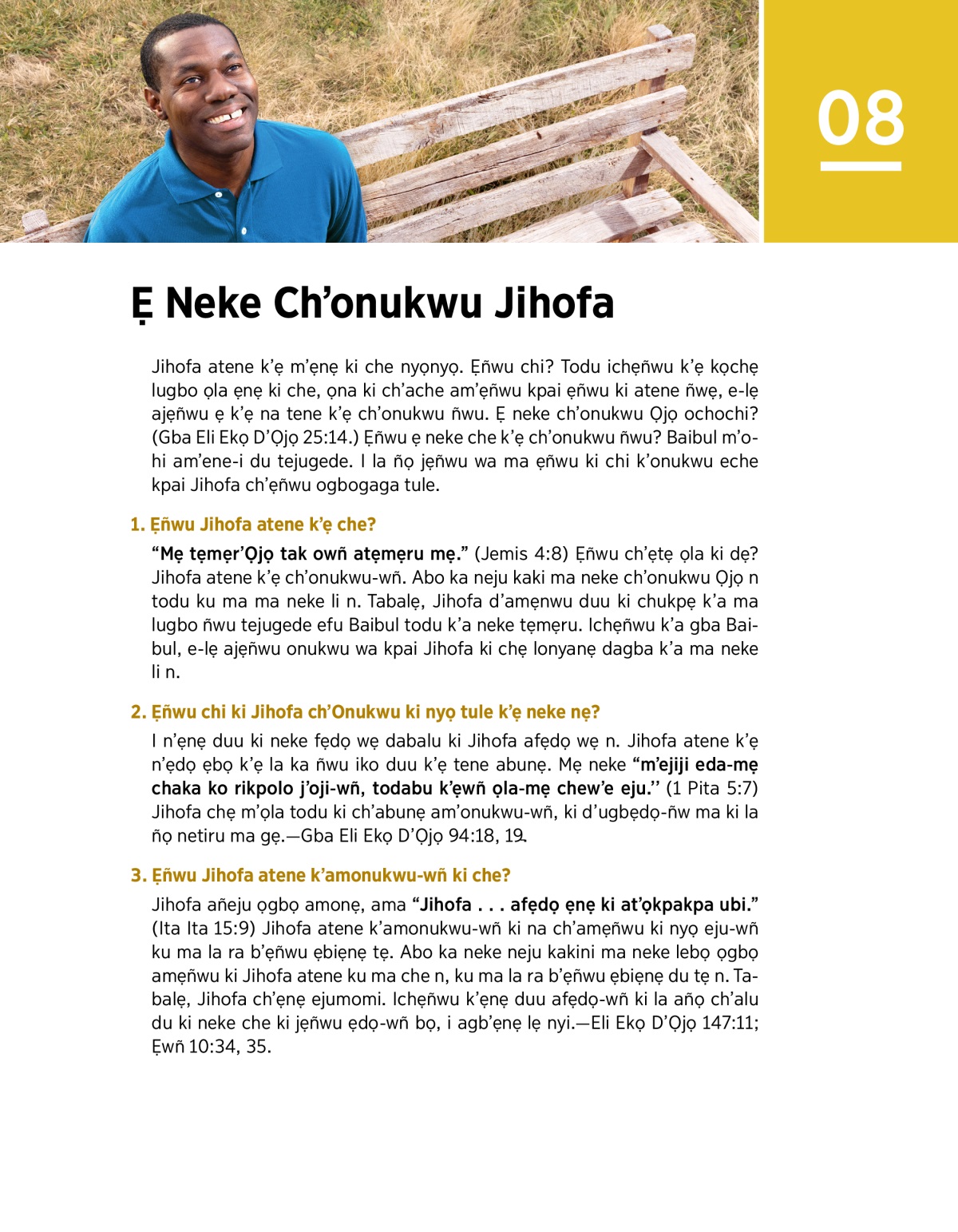 Jihofa atene k’ẹ m’ẹnẹ ki che nyọnyọ. Ẹñwu chi? Todu ichẹñwu k’ẹ kọchẹ lugbo ọla ẹnẹ ki che, ọna ki ch’ache am’ẹñwu kpai ẹñwu ki atene ñwẹ, e-lẹ ajẹñwu ẹ k’ẹ na tene k’ẹ ch’onukwu ñwu. Ẹ neke ch’onukwu Ọjọ ochochi? (Gba Eli Ekọ D’Ọjọ 25:14.) Ẹñwu ẹ neke che k’ẹ ch’onukwu ñwu? Baibul m’ohi am’ene-i du tejugede. I la ñọ jẹñwu wa ma ẹñwu ki chi k’onukwu eche kpai Jihofa ch’ẹñwu ogbogaga tule.