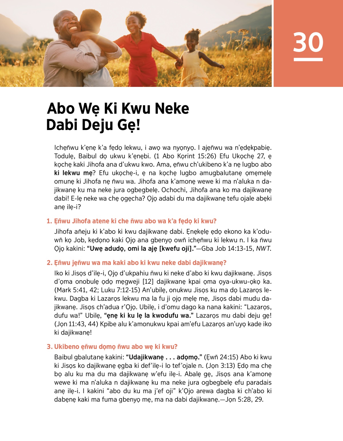 Iko ki Jisọs d’ilẹ-i, Ọjọ d’ukpahiu ñwu ki neke d’abo ki kwu dajikwanẹ. Jisọs d’ọma onobulẹ ọdọ mẹgweji [12] dajikwanẹ kpai ọma ọya-ukwu-ọkọ ka. (Mark 5:41, 42; Luku 7:12-15) An’ubilẹ, onukwu Jisọs ku ma dọ Lazarọs lekwu. Dagba ki Lazarọs lekwu ma la fu ji ọjọ mẹlẹ mẹ, Jisọs dabi mudu dajikwanẹ. Jisọs ch’adua r’Ọjọ. Ubilẹ, i d’omu dago ka nana kakini: “Lazarọs, dufu wa!” Ubilẹ, “ẹnẹ ki ku lẹ la kwodufu wa.” Lazarọs mu dabi deju gẹ! (Jọn 11:43, 44) Kpibe alu k’amonukwu kpai am’efu Lazarọs an’uyọ kade iko ki dajikwanẹ!