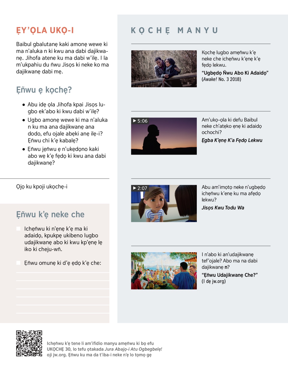 Ichẹñwu k’ẹnẹ k’a fẹdọ lekwu, i awọ wa nyọnyọ. I ajẹñwu wa n’ẹdẹkpabiẹ. Todulẹ, Baibul dọ ukwu k’ẹnẹbi. (1 Abo Kọrint 15:26) Efu Ukọchẹ 27, ẹ kọchẹ kaki Jihofa ana d’ukwu kwo. Ama, ẹñwu ch’ukibeno k’a nẹ lugbo abo ki lekwu mẹ? Efu ukọchẹ-i, ẹ na kọchẹ lugbo amugbalutanẹ ọmẹmẹlẹ omunẹ ki Jihofa nẹ ñwu wa. Jihofa ana k’amonẹ wewe ki ma n’aluka n dajikwanẹ ku ma neke jura ogbegbelẹ. Ochochi, Jihofa ana ko ma dajikwanẹ dabi! E-lẹ neke wa chẹ ọgẹcha? Ọjọ adabi du ma dajikwanẹ tefu ojale abẹki anẹ ilẹ-i?