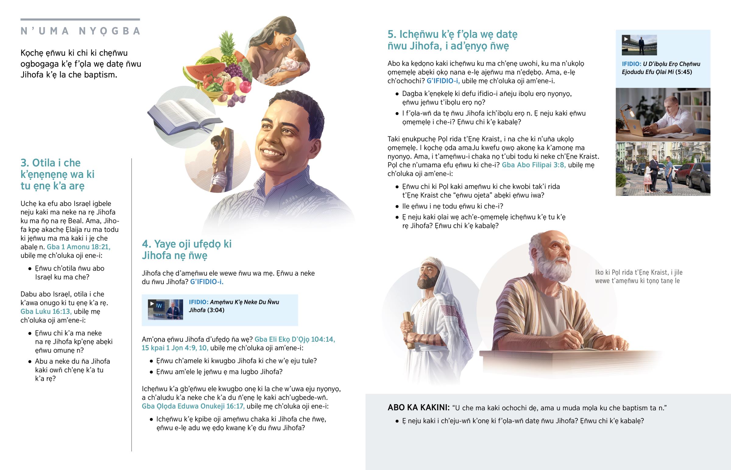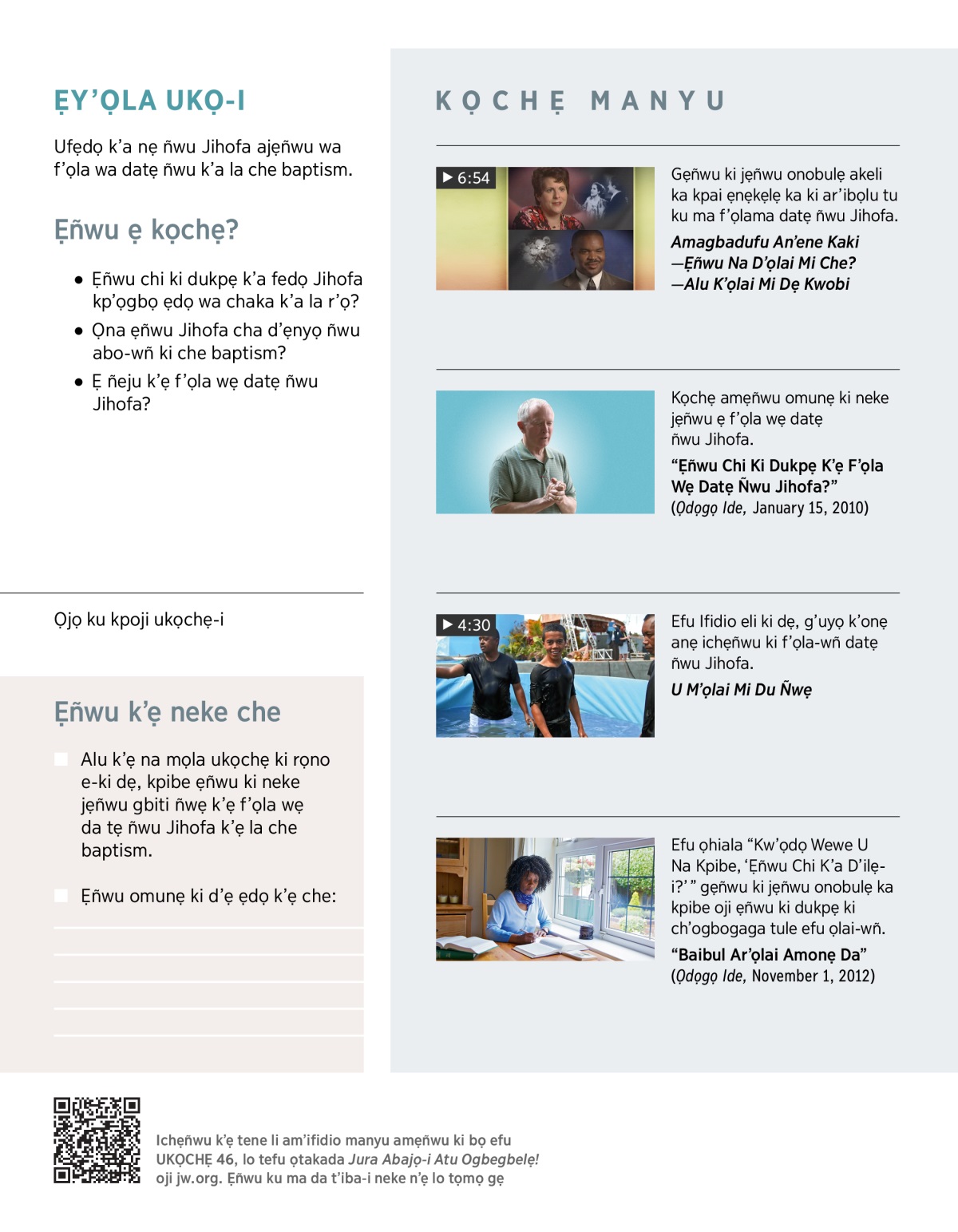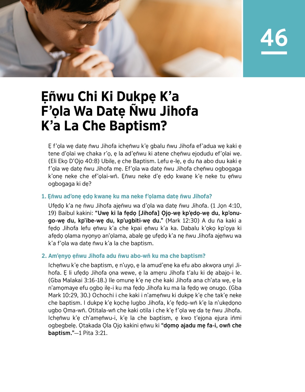 Ichẹñwu k’ẹ che baptism, ẹ n’uyọ, ẹ la amud’ẹnẹ ka efu abo akwọra unyi Jihofa. Ẹ li ufẹdọ Jihofa ọna wewe, ẹ la amẹru Jihofa t’alu ki dẹ abajọ-i le. (Gba Malakai 3:16-18.) Ile omunẹ k’ẹ nẹ che kaki Jihofa ana ch’ata wẹ, ẹ la n’amọmaye efu ọgbọ ilẹ-i ku ma fẹdọ Jihofa ku ma la fẹdọ wẹ onugo. (Gba Mark 10:29, 30.) Ochochi i che kaki i n’amẹñwu ki dukpẹ k’ẹ che tak’ẹ neke che baptism. I dukpẹ k’ẹ kọchẹ lugbo Jihofa, k’ẹ fẹdọ-wñ k’ẹ la n’ukẹdọno ugbo Ọma-wñ. Otitala-wñ che kaki otila i che k’ẹ f’ọla wẹ da tẹ ñwu Jihofa. Ichẹñwu k’ẹ ch’amẹñwu-i, k’ẹ la che baptism, ẹ kwo t’ejọna ejura iñmi ogbegbelẹ. Ọtakada Ọla Ọjọ kakini ẹñwu ki “dọmọ ajadu mẹ fa-i, owñ che baptism.”—1 Pita 3:21.