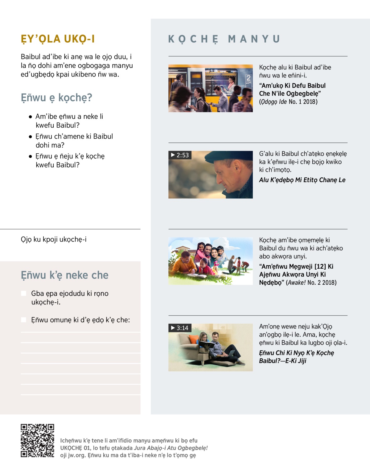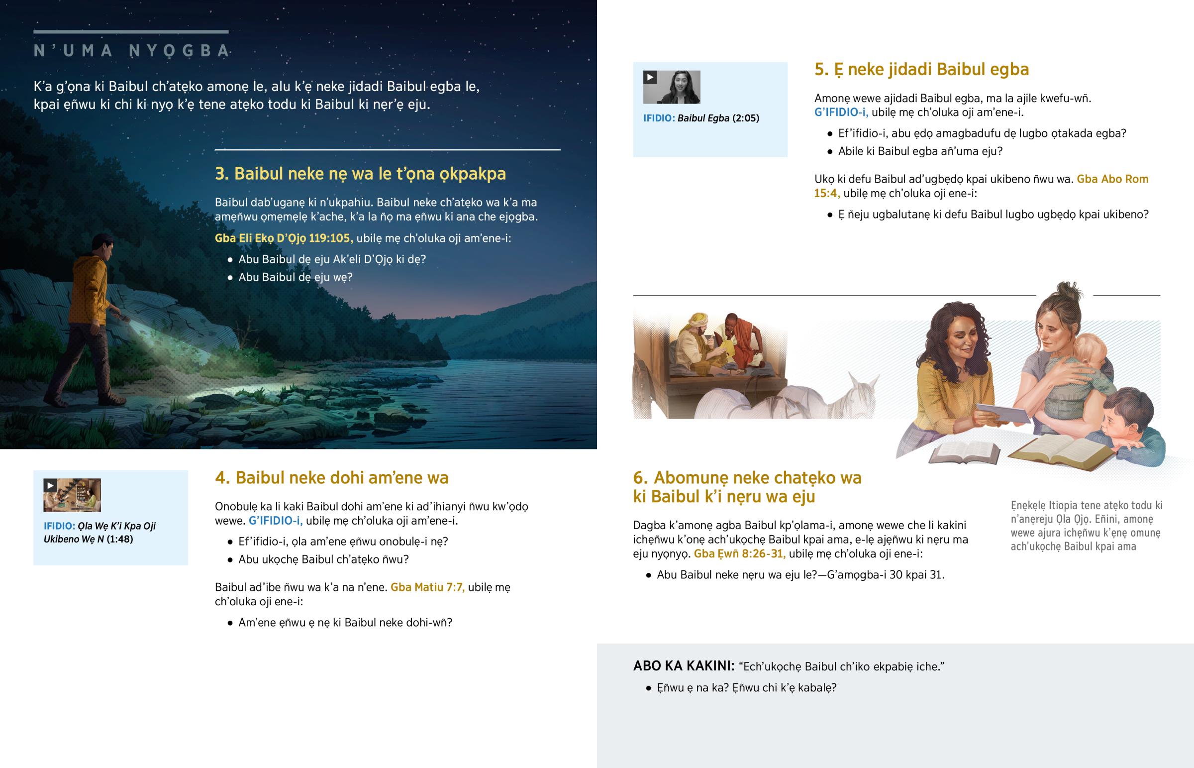 Baibul ad’ibe ọmẹmẹlẹ ñwu wa. K’a g’ujiwe, Baibul akọ abo akwọra unyi alu ku ma neke n’ẹdẹbọ le. I la ad’ibe ñwu wa ẹñwu k’a ache ichẹñwu k’a defu ihianyi kpai alu k’a neke n’ẹdẹbọ efu ukọlọ wa. Ẹ ñọ kọchẹ ẹñwu ki Baibul akọ wa lugbo am’oji ọla-i manyu amẹñwu wewe omunẹ alu k’a ch’oluka kwefu ọtakada-i dama. E-i neke jẹñwu ẹ ma kakini “ọla ọtakada-wñ du [Ọtakada Ọla Ọjọ] . . . chen’ile.”—2 Timoti 3:16.