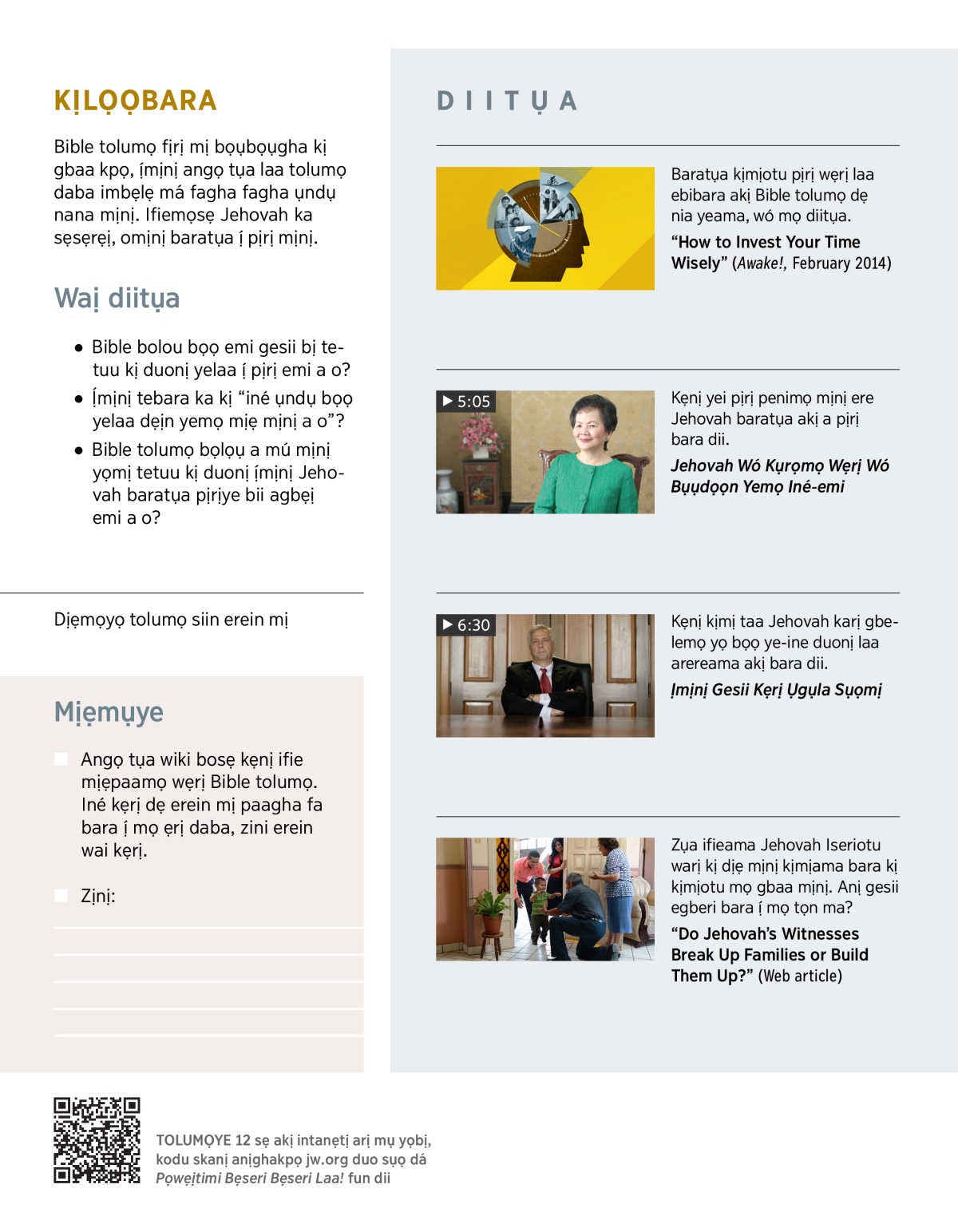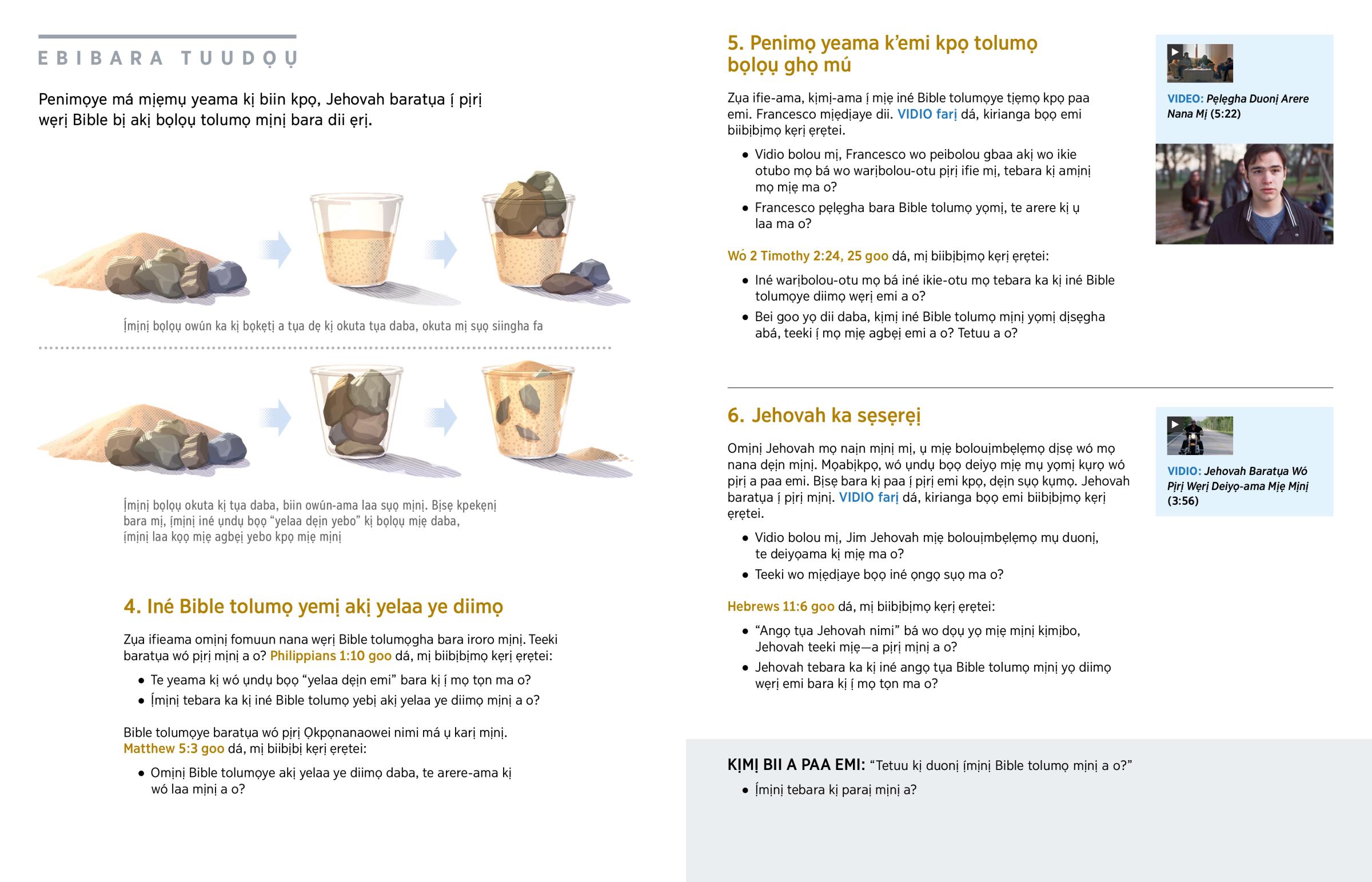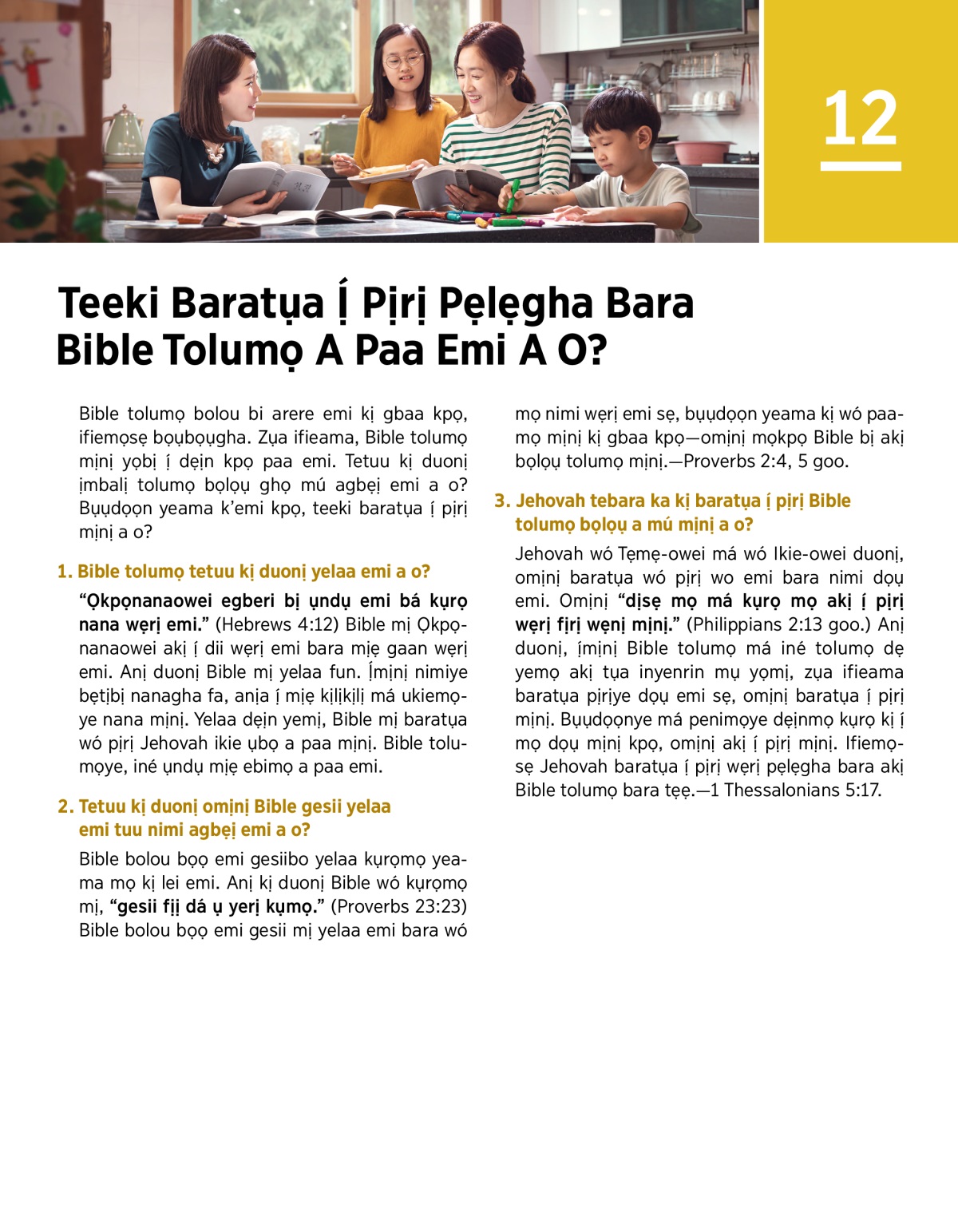 Jehovah wó Tẹmẹ-owei má wó Ikie-owei duonị, omịnị baratụa wó pịrị wo emi bara nimi dọụ emi. Omịnị “dịsẹ mọ má kụrọ mọ akị ị́ pịrị wẹrị fịrị wẹnị mịnị.” (Philippians 2:13 goo.) Anị duonị, ị́mịnị Bible tolumọ má iné tolumọ dẹ yemọ akị tụa inyenrin mụ yọmị, zụa ifieama baratụa pịrịye dọụ emi sẹ, omịnị baratụa ị́ pịrị mịnị. Bụụdọọnye má penimọye dẹịnmọ kụrọ kị ị́ mọ dọụ mịnị kpọ, omịnị akị ị́ pịrị mịnị. Ifiemọsẹ Jehovah baratụa ị́ pịrị wẹrị pẹlẹgha bara akị Bible tolumọ bara tẹẹ.—1 Thessalonians 5:17.