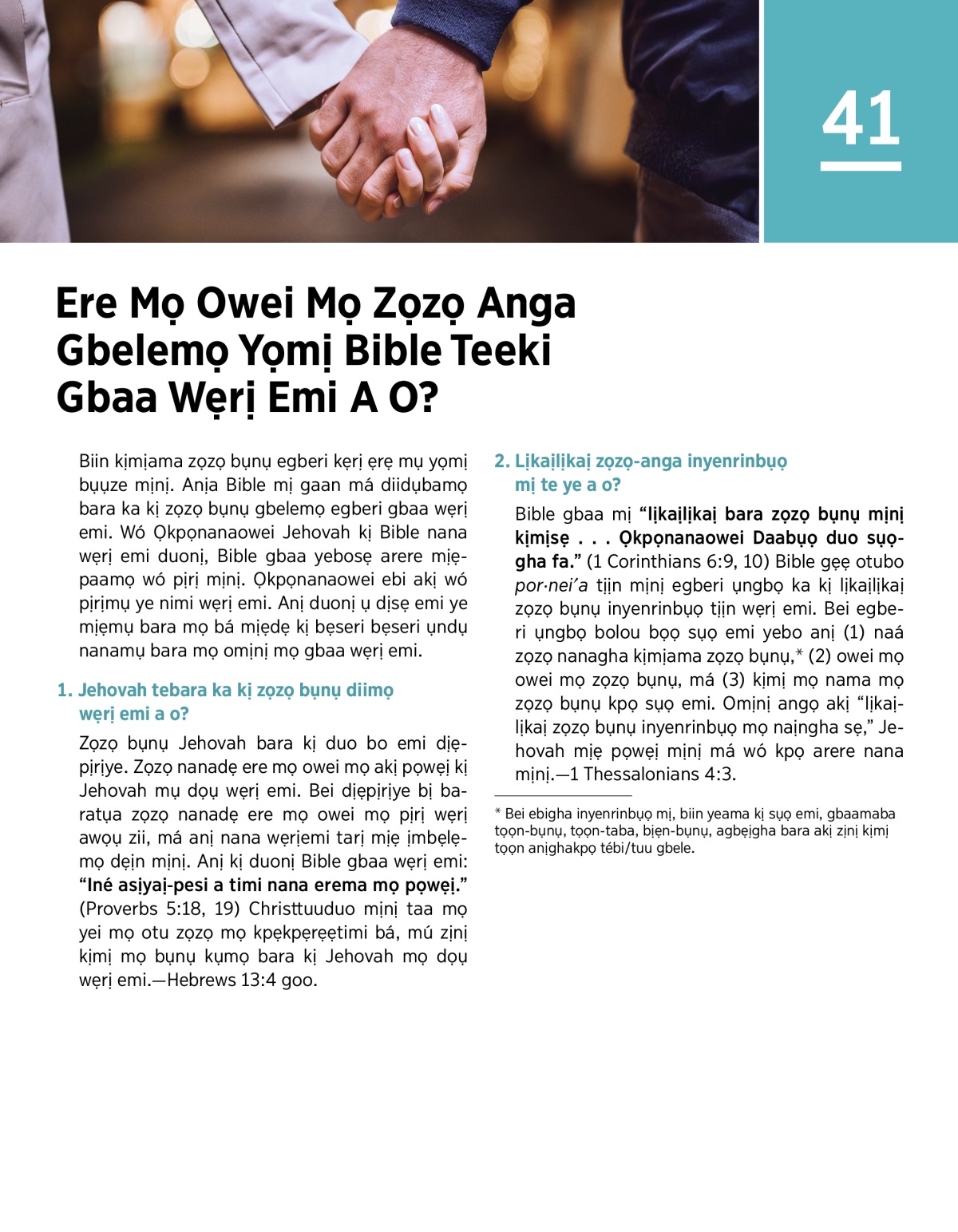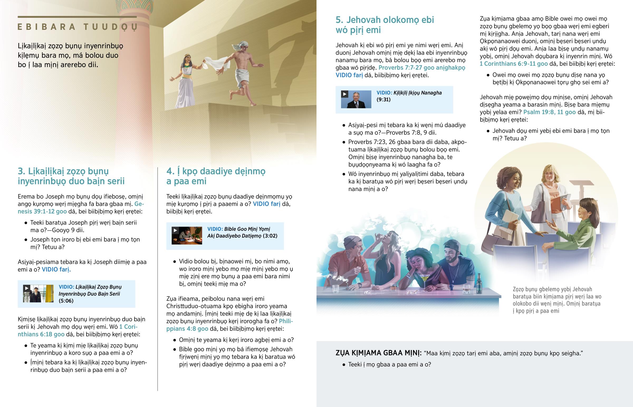 Zụa kịmịama gbaa amọ Bible owei mọ owei mọ zọzọ bụnụ gbelemọ yọ bọọ gbaa wẹrị emi egberi mị kịrịịgha. Anịa Jehovah, tarị nana wẹrị emi Ọkpọnanaowei duonị, omịnị bẹseri bẹseri ụndụ akị wó pịrị dọụ emi. Anịa laa bịsẹ ụndụ nanamụ yọbị, omịnị Jehovah dọụbara kị inyenrin mịnị. Wó 1 Corinthians 6:9-11 goo dá, bei biibịbị kẹrị ẹrẹtei: