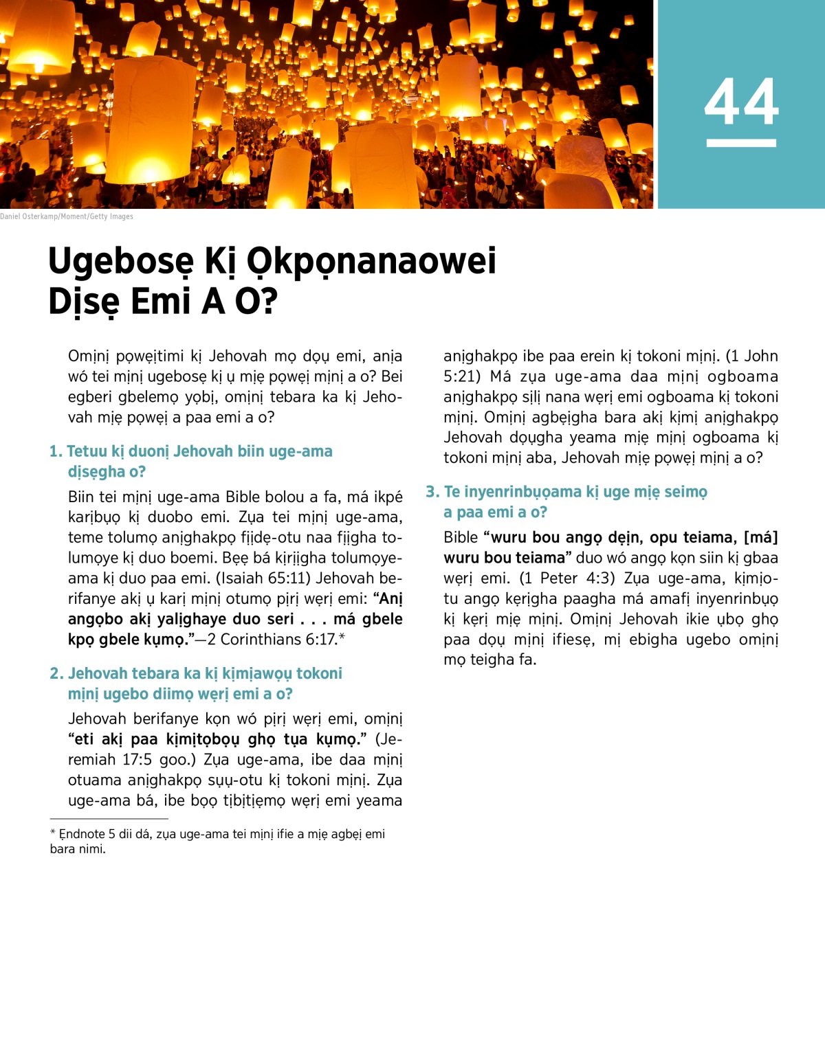 Jehovah berifanye kọn wó pịrị wẹrị emi, omịnị “eti akị paa kịmịtọbọụ ghọ tụa kụmọ.” (Jeremiah 17:5 goo.) Zụa uge-ama, ibe daa mịnị otuama anịghakpọ sụụ-otu kị tokoni mịnị. Zụa uge-ama bá, ibe bọọ tịbịtịẹmọ wẹrị emi yeama anịghakpọ ibe paa erein kị tokoni mịnị. (1 John 5:21) Má zụa uge-ama daa mịnị ogboama anịghakpọ sịlị nana wẹrị emi ogboama kị tokoni mịnị. Omịnị agbẹịgha bara akị kịmị anịghakpọ Jehovah dọụgha yeama mịẹ mịnị ogboama kị tokoni mịnị aba, Jehovah mịẹ pọwẹị mịnị a o?
