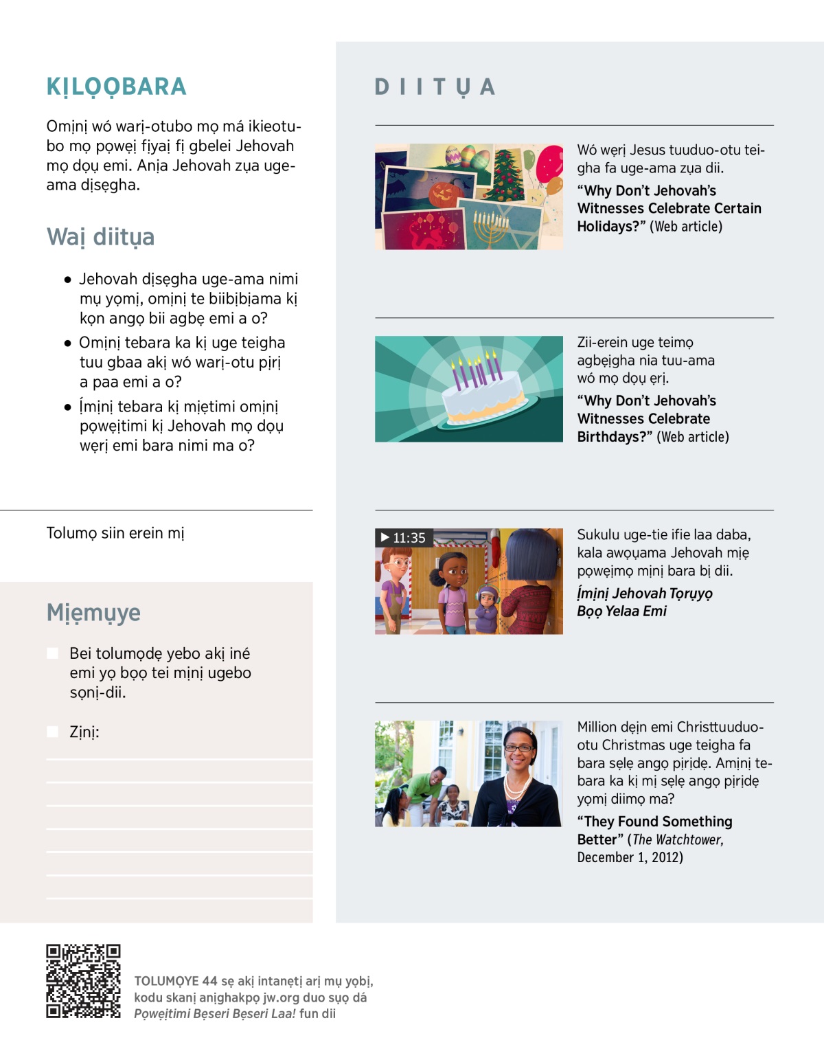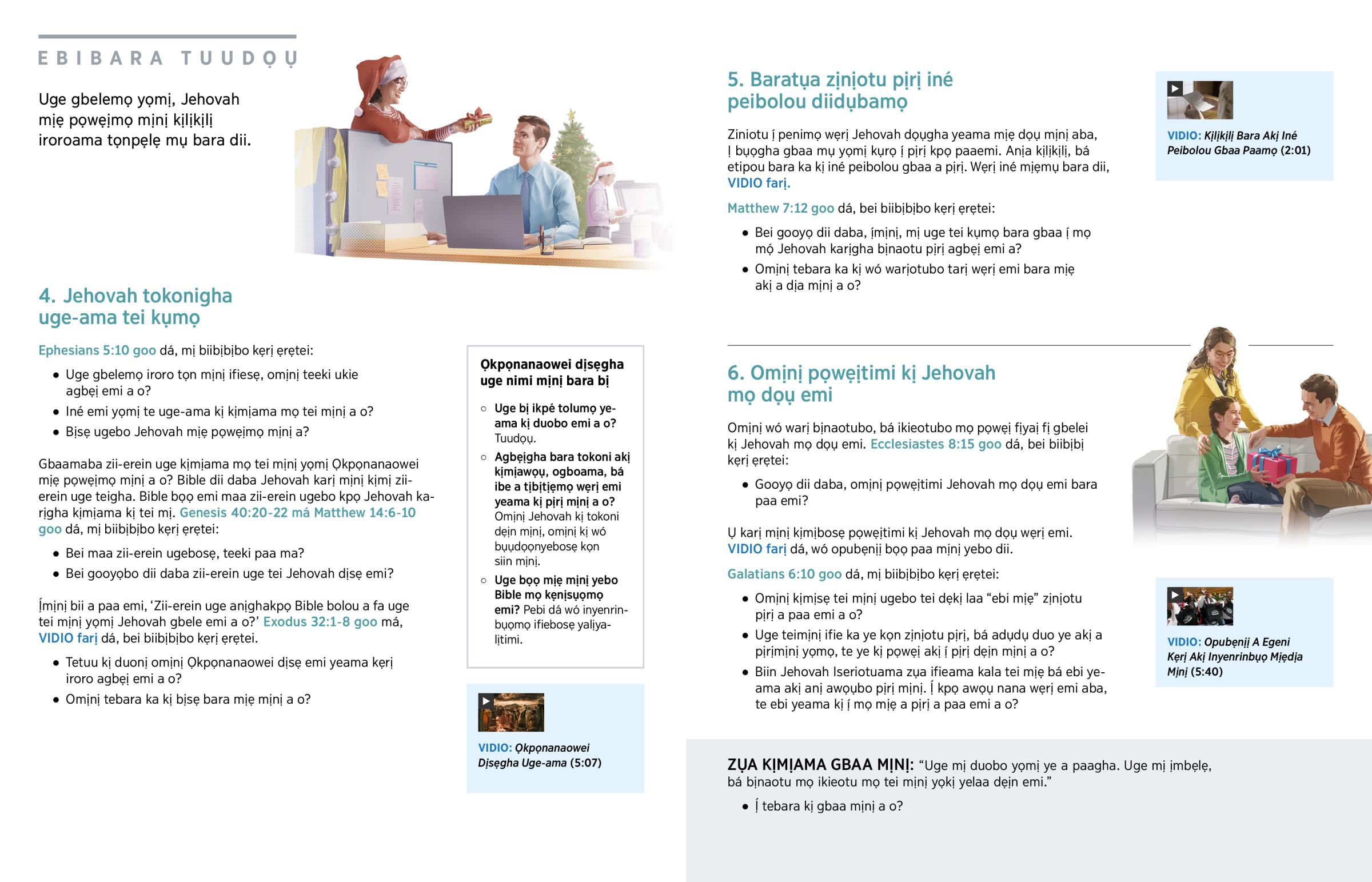 Agbẹịgha bara tokoni akị kịmịawọụ, ogboama, bá ibe a tịbịtịẹmọ wẹrị emi yeama kị pịrị mịnị a o? Omịnị Jehovah kị tokoni dẹịn mịnị, omịnị kị wó bụụdọọnyebosẹ kọn siin mịnị.