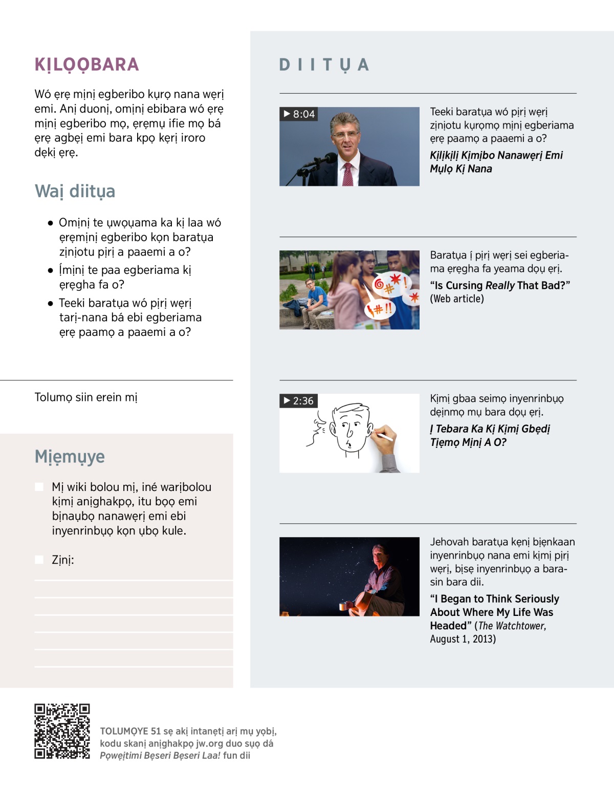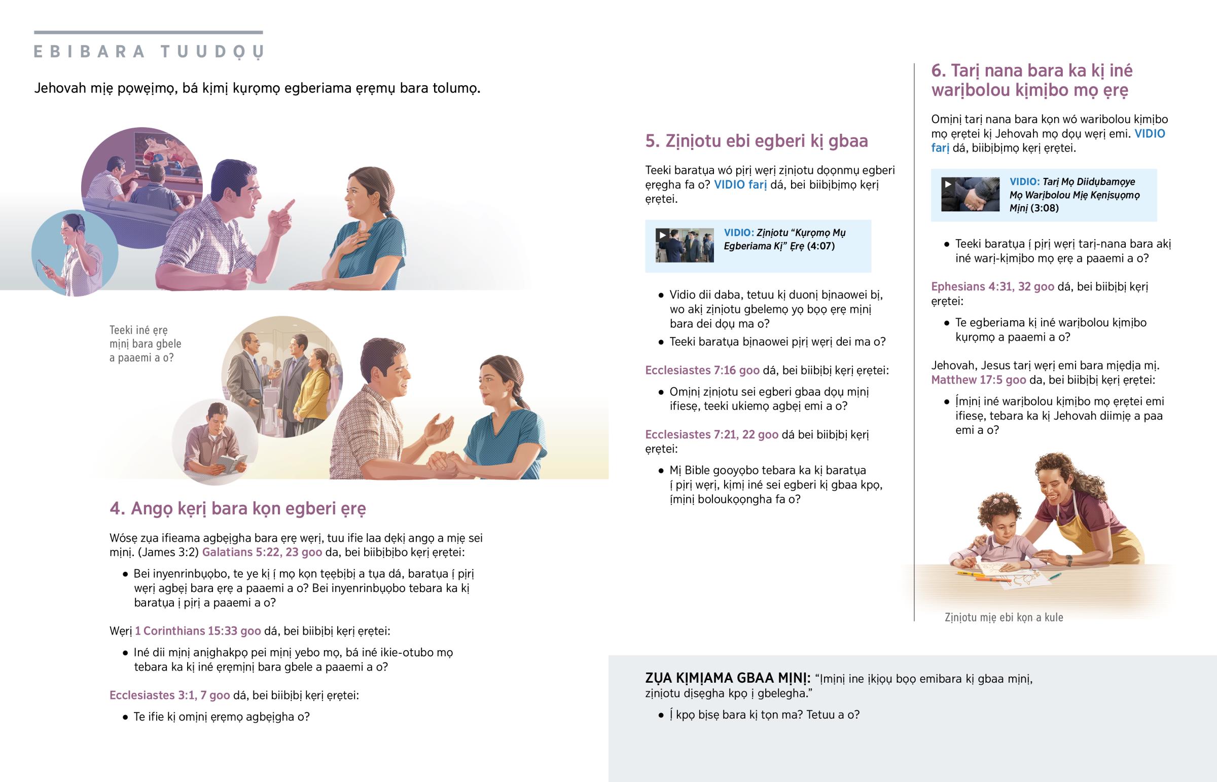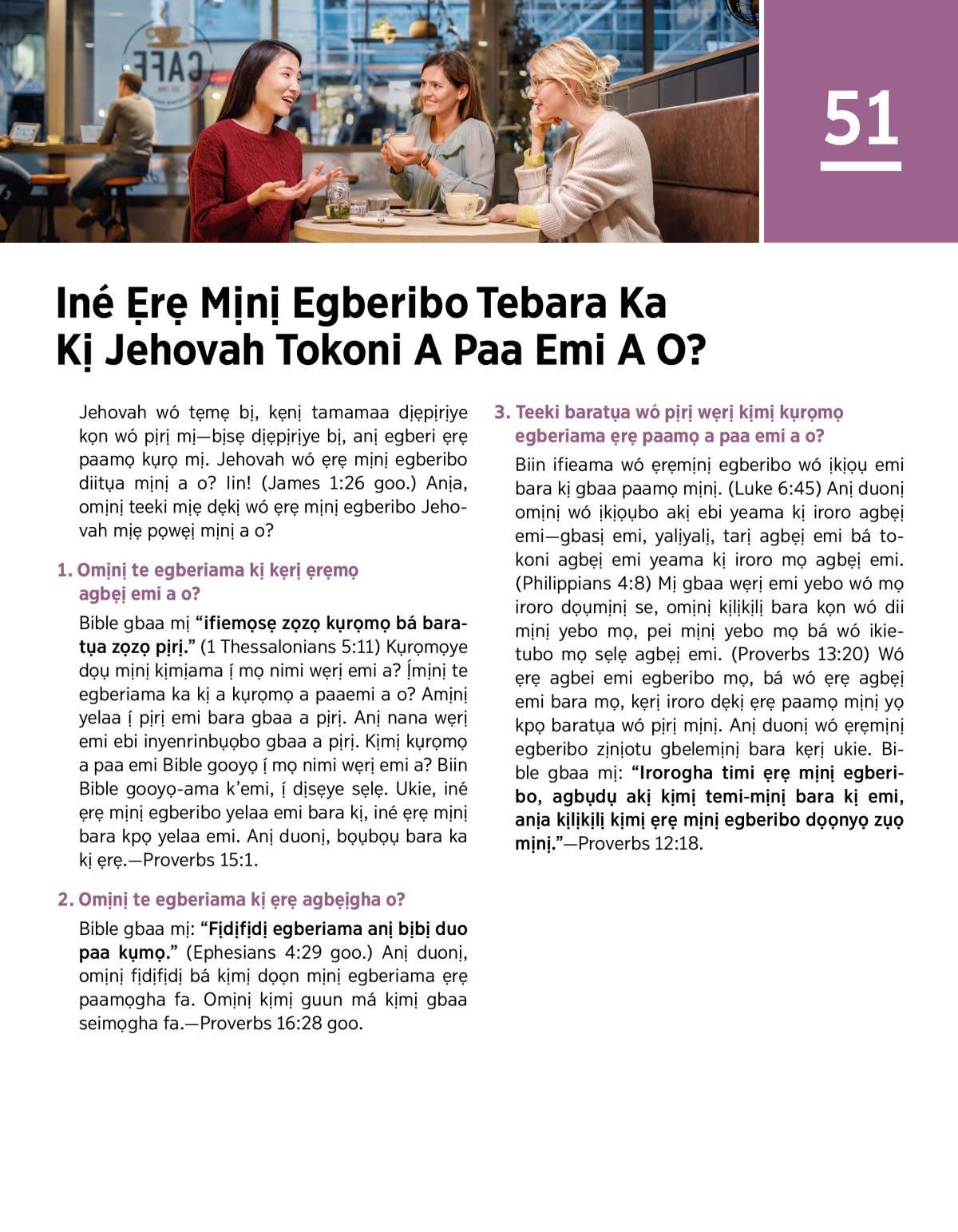 Bible gbaa mị “ifiemọsẹ zọzọ kụrọmọ bá baratụa zọzọ pịrị.” (1 Thessalonians 5:11) Kụrọmọye dọụ mịnị kịmịama ị́ mọ nimi wẹrị emi a? Ị́mịnị te egberiama ka kị a kụrọmọ a paaemi a o? Amịnị yelaa ị́ pịrị emi bara gbaa a pịrị. Anị nana wẹrị emi ebi inyenrinbụọbo gbaa a pịrị. Kịmị kụrọmọ a paa emi Bible gooyọ ị́ mọ nimi wẹrị emi a? Biin Bible gooyọ-ama k’emi, ị́ dịsẹye sẹlẹ. Ukie, iné ẹrẹ mịnị egberibo yelaa emi bara kị, iné ẹrẹ mịnị bara kpọ yelaa emi. Anị duonị, bọụbọụ bara ka kị ẹrẹ.—Proverbs 15:1.