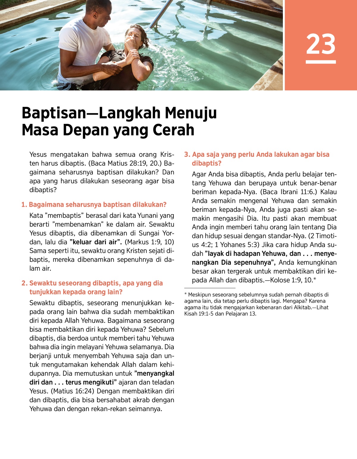 a Meskipun seseorang sebelumnya sudah pernah dibaptis di agama lain, dia tetap perlu dibaptis lagi. Mengapa? Karena agama itu tidak mengajarkan kebenaran dari Alkitab.—Lihat Kisah 19:1-5 dan Pelajaran 13.