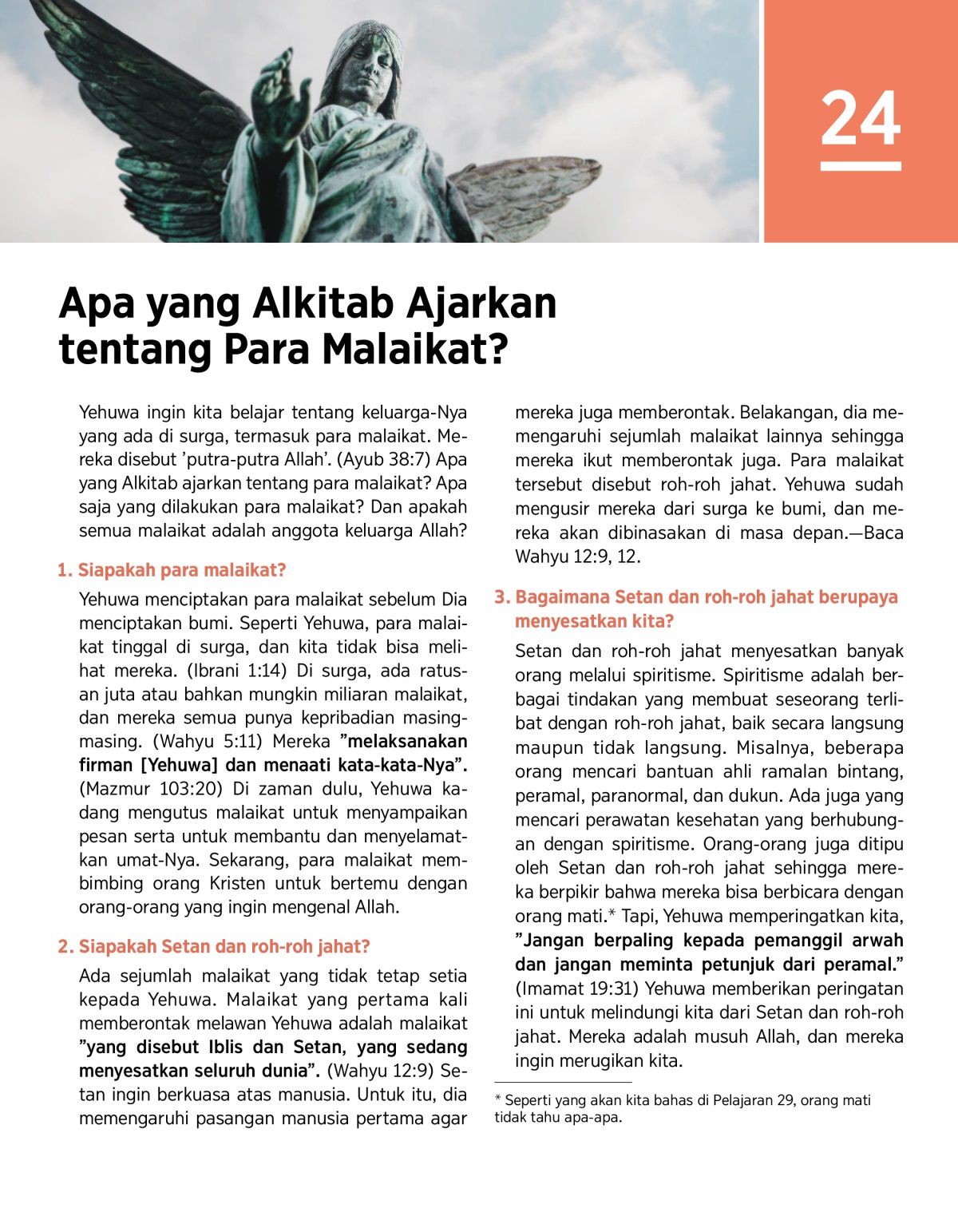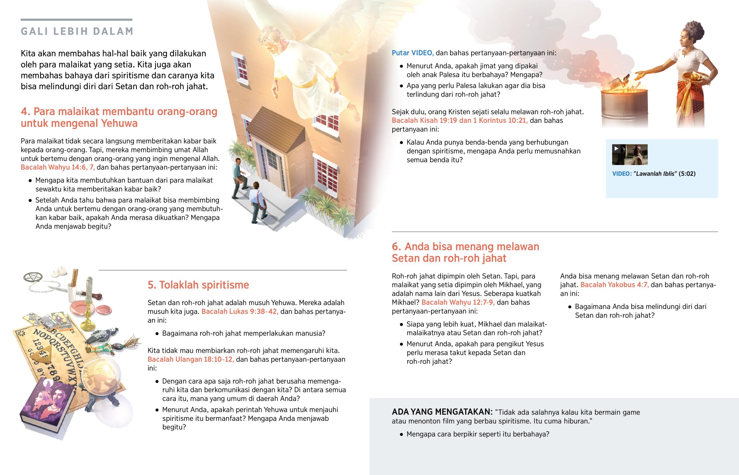 Malaikat-malaikat yang setia selalu membantu kita. Setan dan roh-roh jahat adalah musuh Yehuwa, dan mereka menggunakan spiritisme untuk menyesatkan orang-orang.