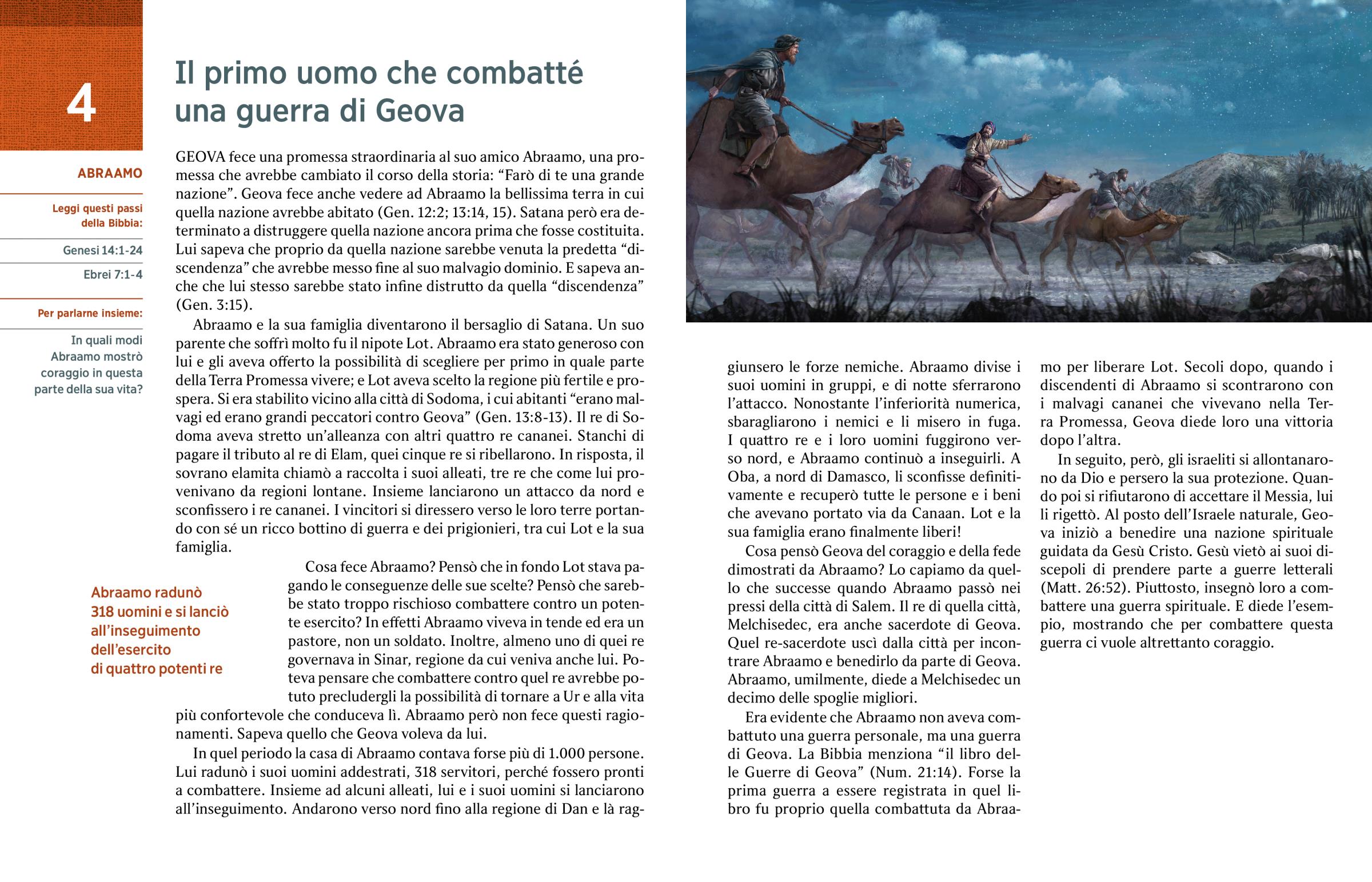 Cosa fece Abraamo? Pensò che in fondo Lot stava pagando le conseguenze delle sue scelte? Pensò che sarebbe stato troppo rischioso combattere contro un potente esercito? In effetti Abraamo viveva in tende ed era un pastore, non un soldato. Inoltre, almeno uno di quei re governava in Sinar, regione da cui veniva anche lui. Poteva pensare che combattere contro quel re avrebbe potuto precludergli la possibilità di tornare a Ur e alla vita più confortevole che conduceva lì. Abraamo però non fece questi ragionamenti. Sapeva quello che Geova voleva da lui.