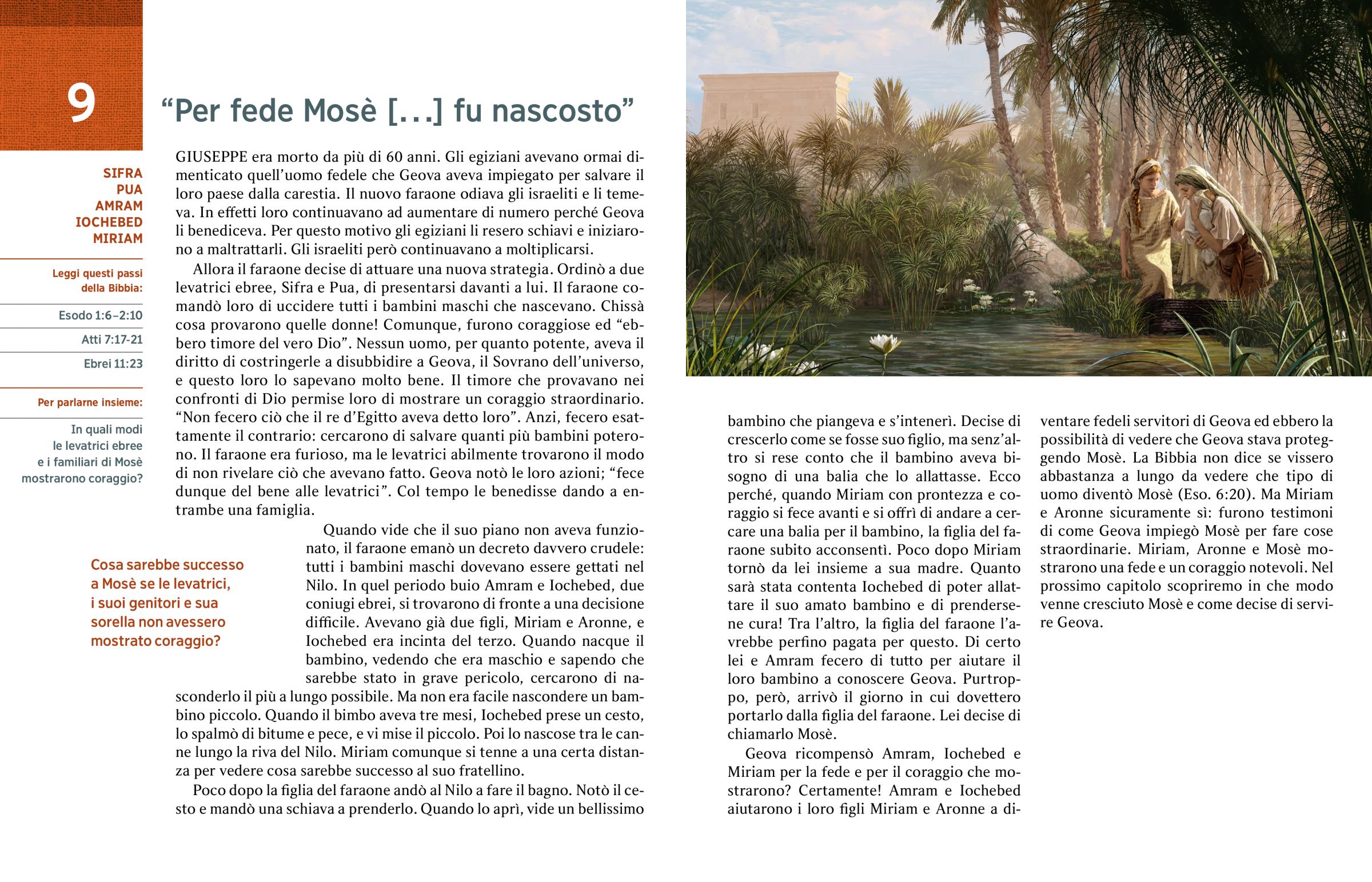 Geova ricompensò Amram, Iochebed e Miriam per la fede e per il coraggio che mostrarono? Certamente! Amram e Iochebed aiutarono i loro figli Miriam e Aronne a diventare fedeli servitori di Geova ed ebbero la possibilità di vedere che Geova stava proteggendo Mosè. La Bibbia non dice se vissero abbastanza a lungo da vedere che tipo di uomo diventò Mosè (Eso. 6:20). Ma Miriam e Aronne sicuramente sì: furono testimoni di come Geova impiegò Mosè per fare cose straordinarie. Miriam, Aronne e Mosè mostrarono una fede e un coraggio notevoli. Nel prossimo capitolo scopriremo in che modo venne cresciuto Mosè e come decise di servire Geova.