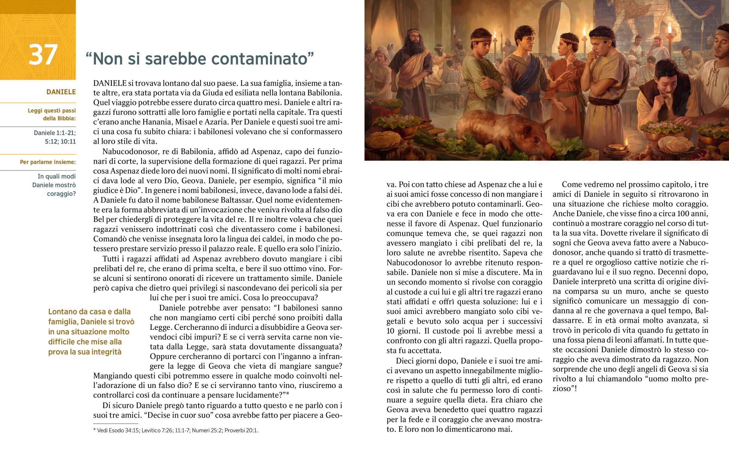 Tutti i ragazzi affidati ad Aspenaz avrebbero dovuto mangiare i cibi prelibati del re, che erano di prima scelta, e bere il suo ottimo vino. Forse alcuni si sentirono onorati di ricevere un trattamento simile. Daniele però capiva che dietro quei privilegi si nascondevano dei pericoli sia per lui che per i suoi tre amici. Cosa lo preoccupava?