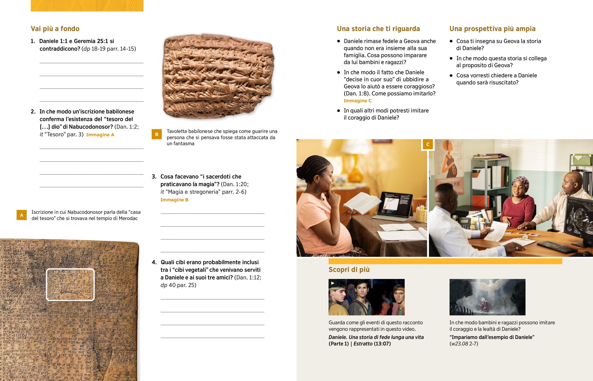 In che modo il fatto che Daniele “decise in cuor suo” di ubbidire a Geova lo aiutò a essere coraggioso? (Dan. 1:8). Come possiamo imitarlo? Immagine C