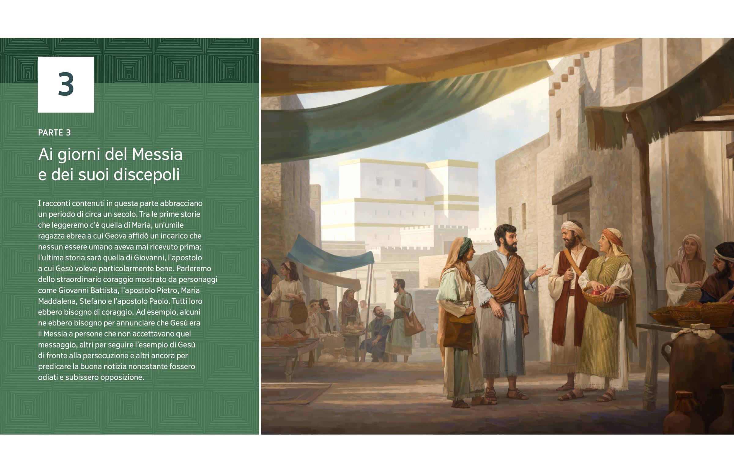 I racconti contenuti in questa parte abbracciano un periodo di circa un secolo. Tra le prime storie che leggeremo c’è quella di Maria, un’umile ragazza ebrea a cui Geova affidò un incarico che nessun essere umano aveva mai ricevuto prima; l’ultima storia sarà quella di Giovanni, l’apostolo a cui Gesù voleva particolarmente bene. Parleremo dello straordinario coraggio mostrato da personaggi come Giovanni Battista, l’apostolo Pietro, Maria Maddalena, Stefano e l’apostolo Paolo. Tutti loro ebbero bisogno di coraggio. Ad esempio, alcuni ne ebbero bisogno per annunciare che Gesù era il Messia a persone che non accettavano quel messaggio, altri per seguire l’esempio di Gesù di fronte alla persecuzione e altri ancora per predicare la buona notizia nonostante fossero odiati e subissero opposizione.