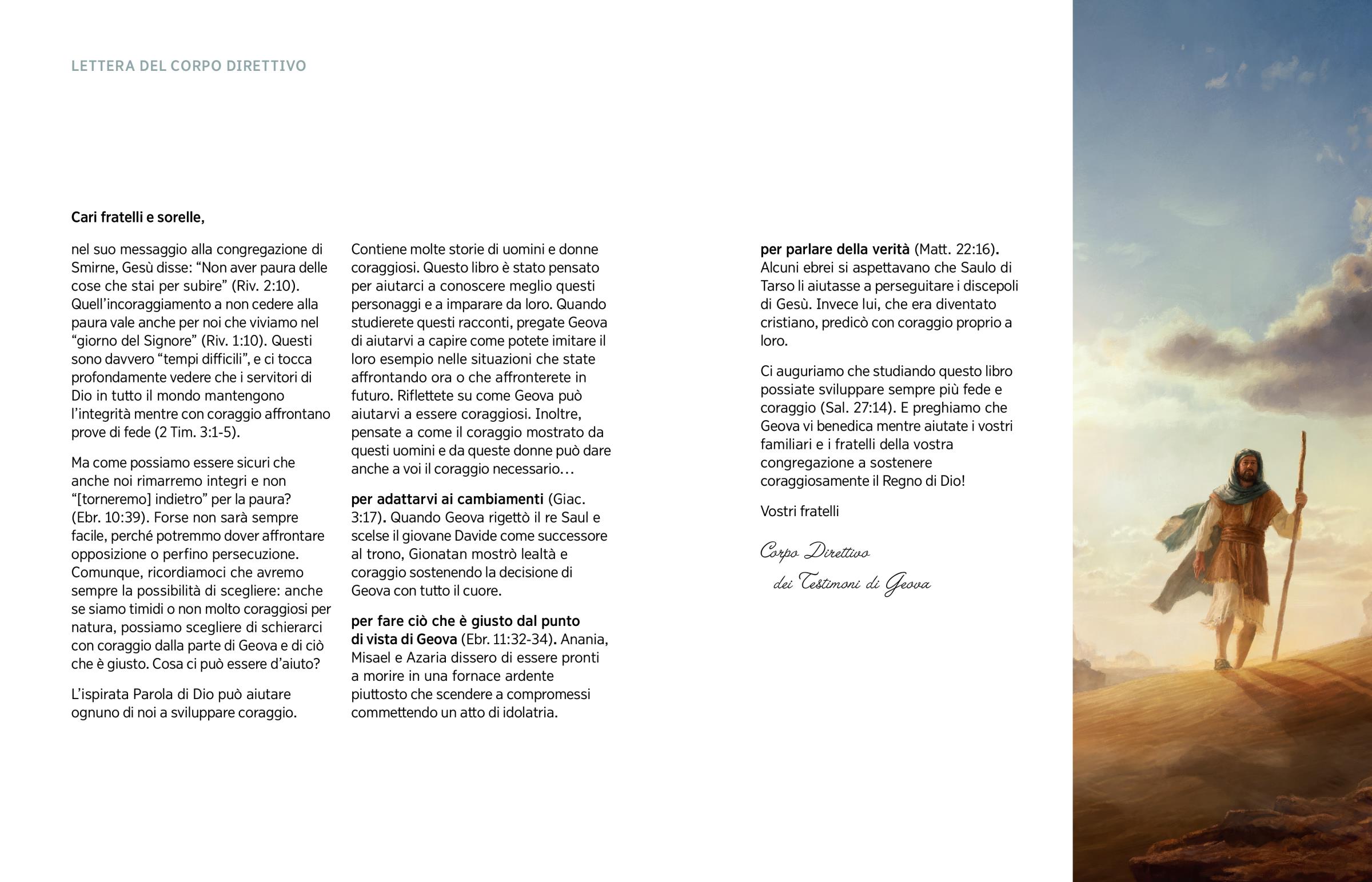 L’ispirata Parola di Dio può aiutare ognuno di noi a sviluppare coraggio. Contiene molte storie di uomini e donne coraggiosi. Questo libro è stato pensato per aiutarci a conoscere meglio questi personaggi e a imparare da loro. Quando studierete questi racconti, pregate Geova di aiutarvi a capire come potete imitare il loro esempio nelle situazioni che state affrontando ora o che affronterete in futuro. Riflettete su come Geova può aiutarvi a essere coraggiosi. Inoltre, pensate a come il coraggio mostrato da questi uomini e da queste donne può dare anche a voi il coraggio necessario...