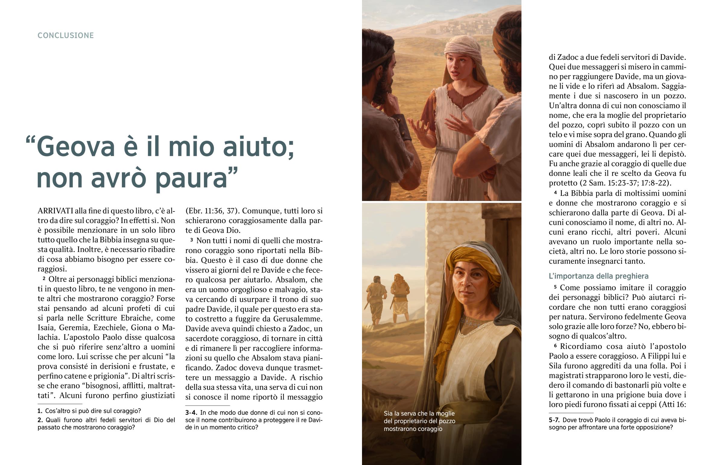3 Non tutti i nomi di quelli che mostrarono coraggio sono riportati nella Bibbia. Questo è il caso di due donne che vissero ai giorni del re Davide e che fecero qualcosa per aiutarlo. Absalom, che era un uomo orgoglioso e malvagio, stava cercando di usurpare il trono di suo padre Davide, il quale per questo era stato costretto a fuggire da Gerusalemme. Davide aveva quindi chiesto a Zadoc, un sacerdote coraggioso, di tornare in città e di rimanere lì per raccogliere informazioni su quello che Absalom stava pianificando. Zadoc doveva dunque trasmettere un messaggio a Davide. A rischio della sua stessa vita, una serva di cui non si conosce il nome riportò il messaggio di Zadoc a due fedeli servitori di Davide. Quei due messaggeri si misero in cammino per raggiungere Davide, ma un giovane li vide e lo riferì ad Absalom. Saggiamente i due si nascosero in un pozzo. Un’altra donna di cui non conosciamo il nome, che era la moglie del proprietario del pozzo, coprì subito il pozzo con un telo e vi mise sopra del grano. Quando gli uomini di Absalom andarono lì per cercare quei due messaggeri, lei li depistò. Fu anche grazie al coraggio di quelle due donne leali che il re scelto da Geova fu protetto (2 Sam. 15:23-37; 17:8-22).