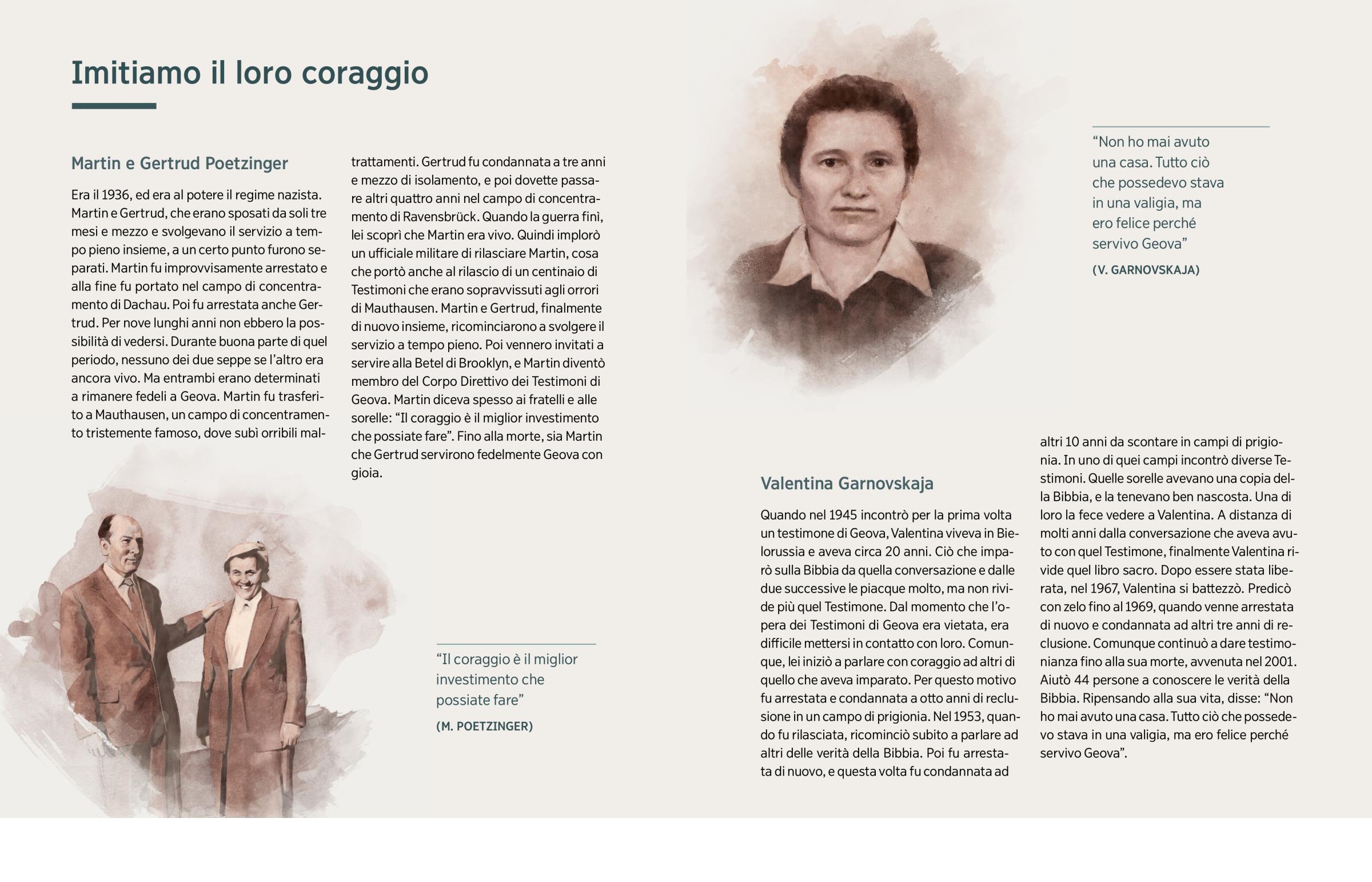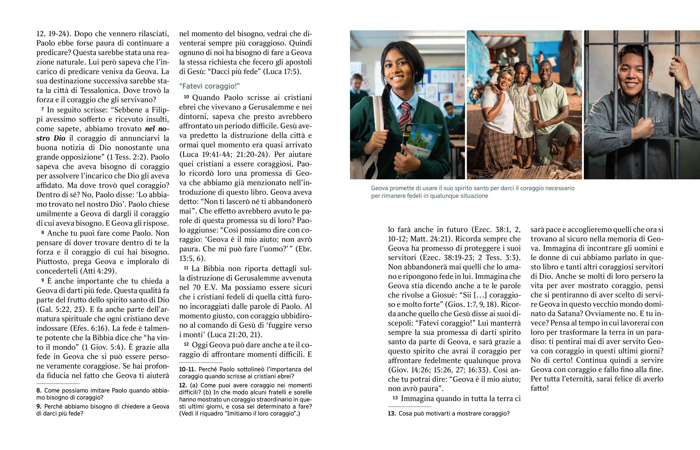 13 Immagina quando in tutta la terra ci sarà pace e accoglieremo quelli che ora si trovano al sicuro nella memoria di Geova. Immagina di incontrare gli uomini e le donne di cui abbiamo parlato in questo libro e tanti altri coraggiosi servitori di Dio. Anche se molti di loro persero la vita per aver mostrato coraggio, pensi che si pentiranno di aver scelto di servire Geova in questo vecchio mondo dominato da Satana? Ovviamente no. E tu invece? Pensa al tempo in cui lavorerai con loro per trasformare la terra in un paradiso: ti pentirai mai di aver servito Geova con coraggio in questi ultimi giorni? No di certo! Continua quindi a servire Geova con coraggio e fallo fino alla fine. Per tutta l’eternità, sarai felice di averlo fatto!