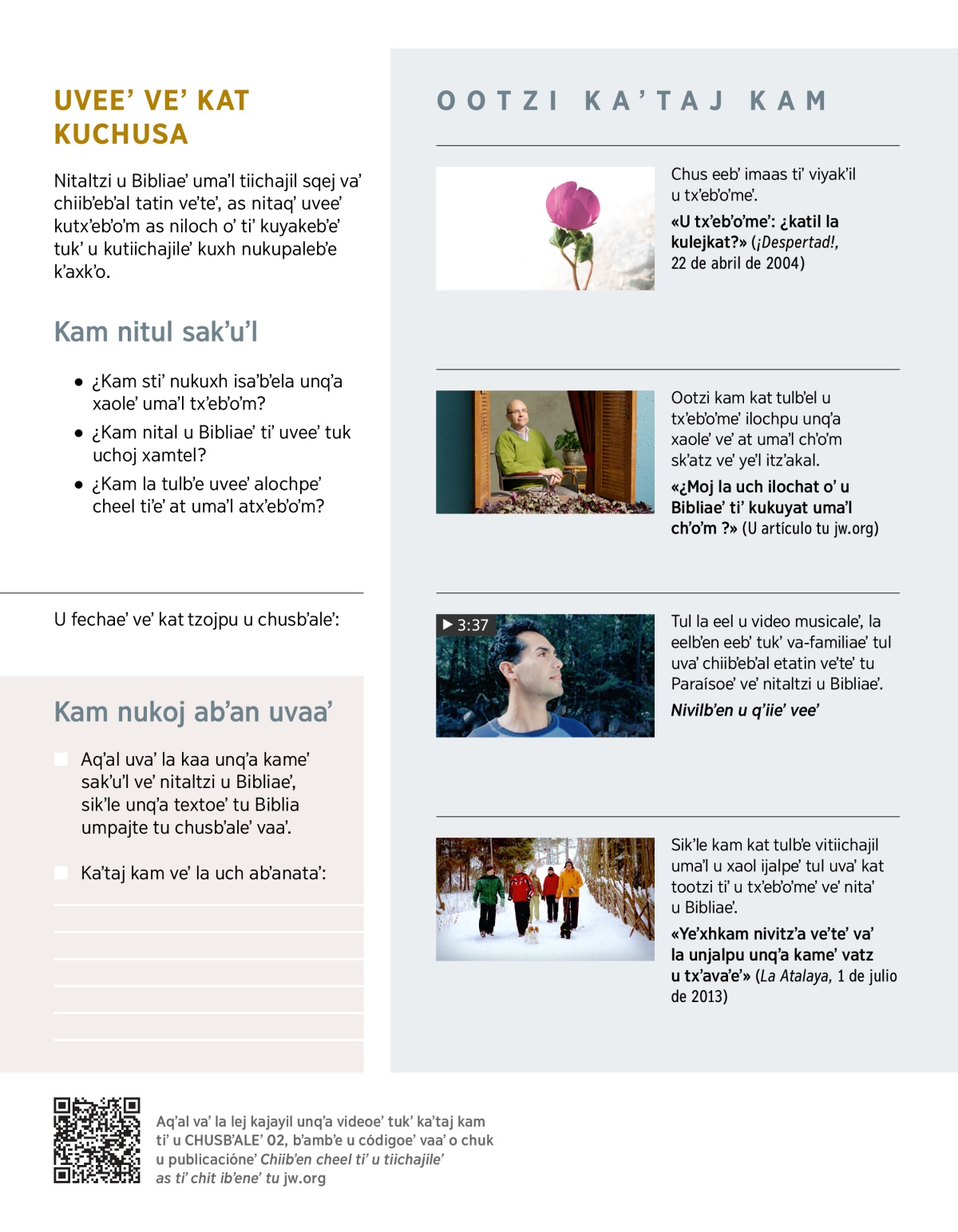 Tuk qil kaʼlaj kam veʼ nitaltzi u Bibliaeʼ tiʼ u kutxʼebʼoʼmeʼ sukuvatzbʼen. Tuk qileʼ kam nitulbʼe u txʼebʼoʼmeʼ veeʼ ilochat kaʼtaj xaol cheel.