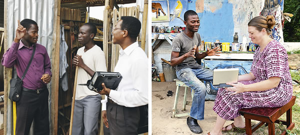 わたしが手話を学んでいる,と聞いた人から,「看板屋のブリースを訪ねてみたら」と言われました。シュロの葉を縫い合わせて作った,ブリースのアトリエつまり仕事場は,蒸し暑い気候の中でも風通しがよく,さわやかでした。壁には,長年の間に幾度もその表面で筆を拭ったため,様々な色から成る虹のような模様が付いていました。ブリースは腰掛けのほこりを払い,こちらをじっと見詰めて,わたしが話し出すのを待っています。わたしが1枚のDVDをポータブル・プレーヤーにセットすると,ブリースは自分の腰掛けをプレーヤーの小さな画面に引き寄せ,「分かる! 分かる!」という意味の手話をしました。近所の子どもたちが集まってきて,首を長くしてのぞき込み,その一人が,思わず,「どうして音の出ない映画を見ているの?」と言いました。