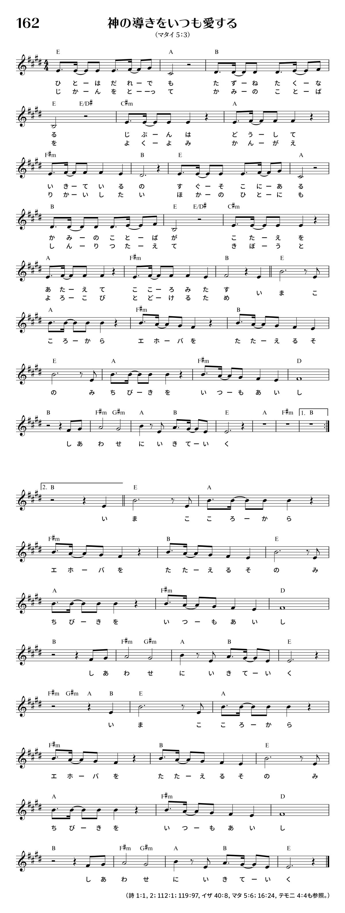 - 2.時間を取って 神の言葉を - よく読み 考え 理解したい - 他の人にも真理伝えて - 希望と喜び 届けるため - (※ 繰り返し) - 今 心からエホバを讃える - その導きをいつも愛し - 幸せに生きていく - 今 心からエホバを讃える - その導きをいつも愛し - 幸せに生きていく - 今 心からエホバを讃える - その導きをいつも愛し - 幸せに生きていく