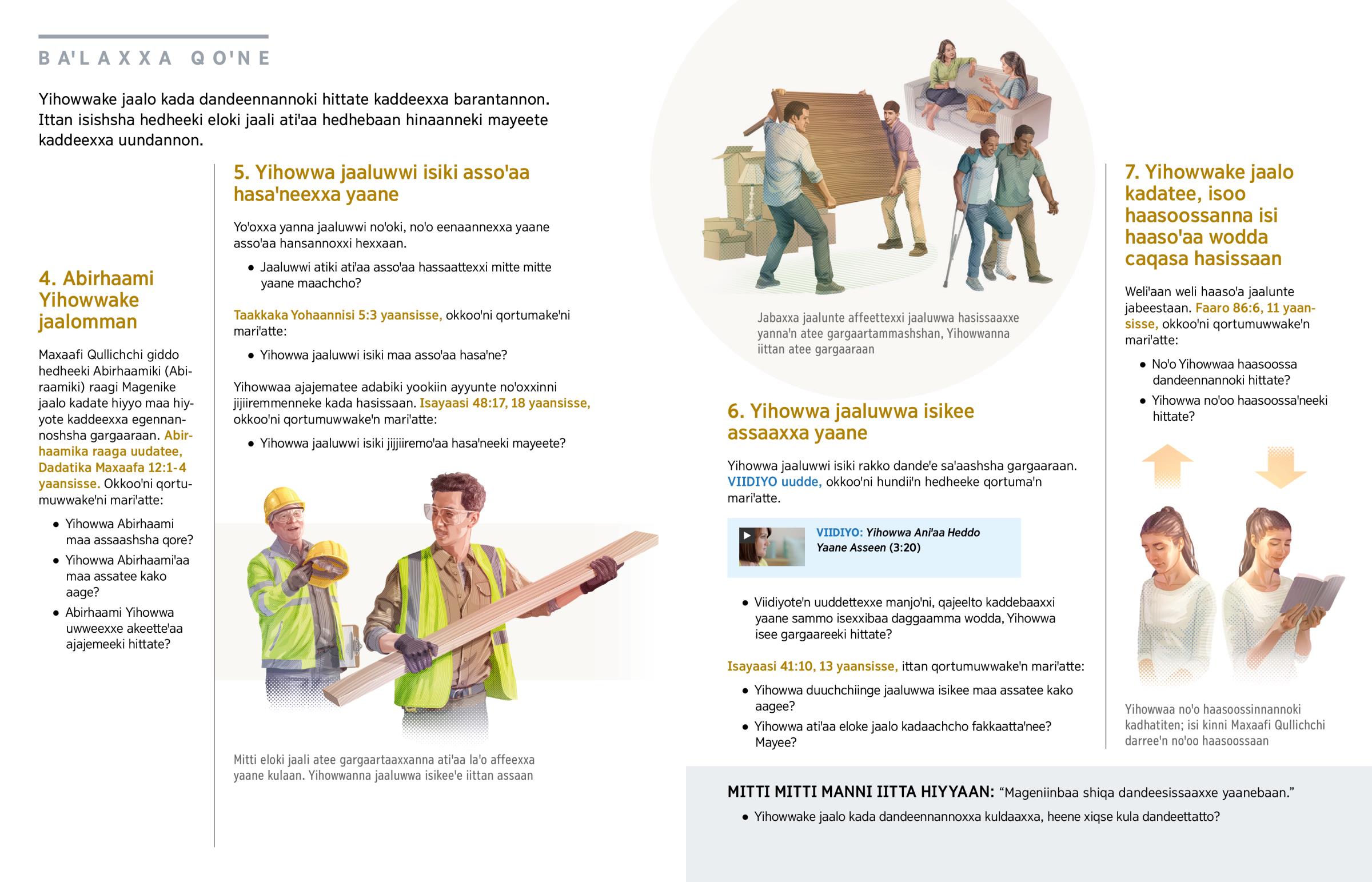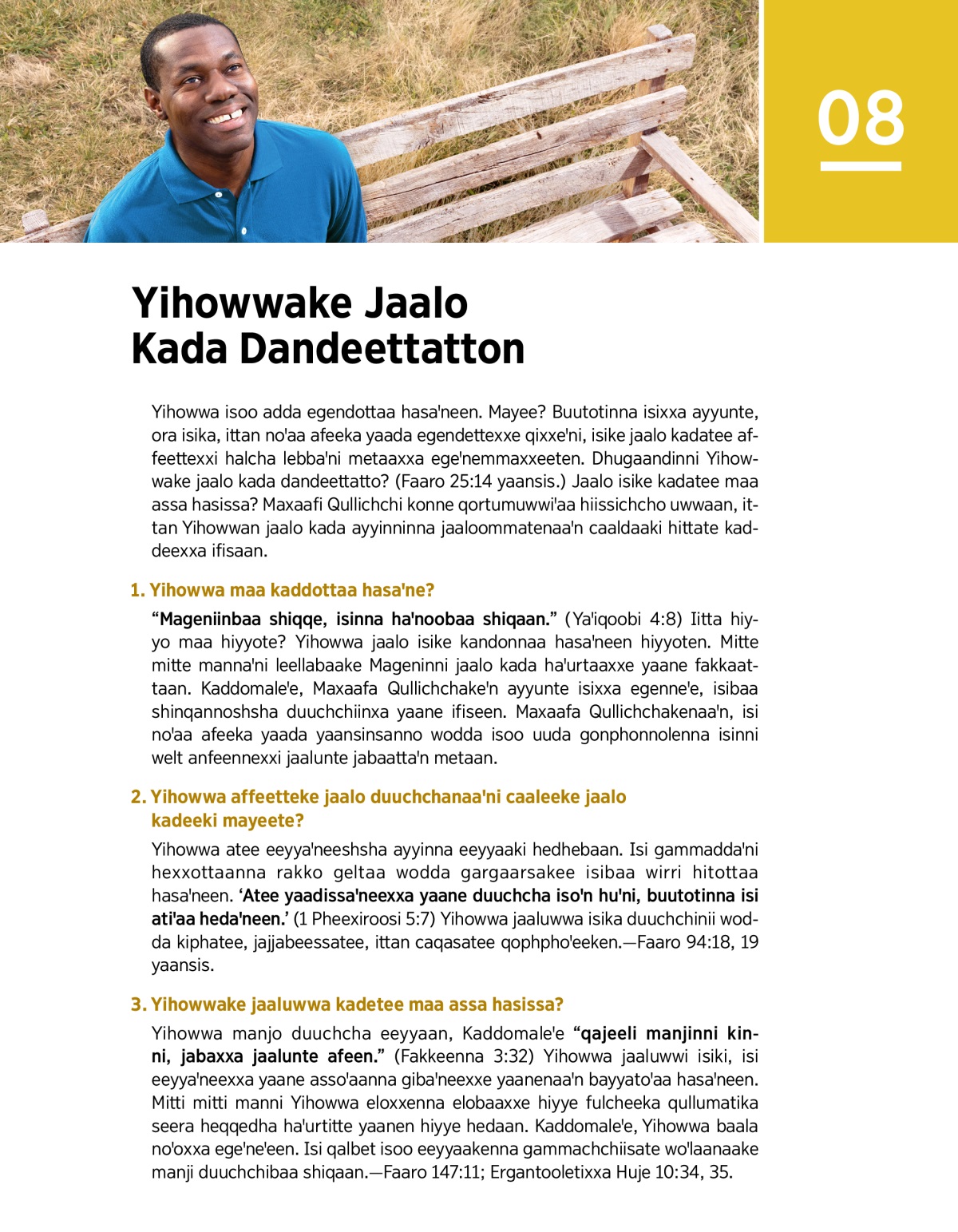 Yihowwa manjo duuchcha eeyyaan, Kaddomaleꞌe “qajeeli manjinni kinni, jabaxxa jaalunte afeen.” (Fakkeenna 3:32) Yihowwa jaaluwwi isiki, isi eeyyaꞌneexxa yaane assoꞌaanna gibaꞌneexxe yaanenaaꞌn bayyatoꞌaa hasaꞌneen. Mitti mitti manni Yihowwa eloxxenna elobaaxxe hiyye fulcheeka qullumatika seera heqqedha haꞌurtitte yaanen hiyye hedaan. Kaddomaleꞌe, Yihowwa baala noꞌoxxa egeꞌneꞌeen. Isi qalbet isoo eeyyaakenna gammachchiisate woꞌlaanaake manji duuchchibaa shiqaan.—Faaro 147:11; Ergantooletixxa Huje 10:34, 35.