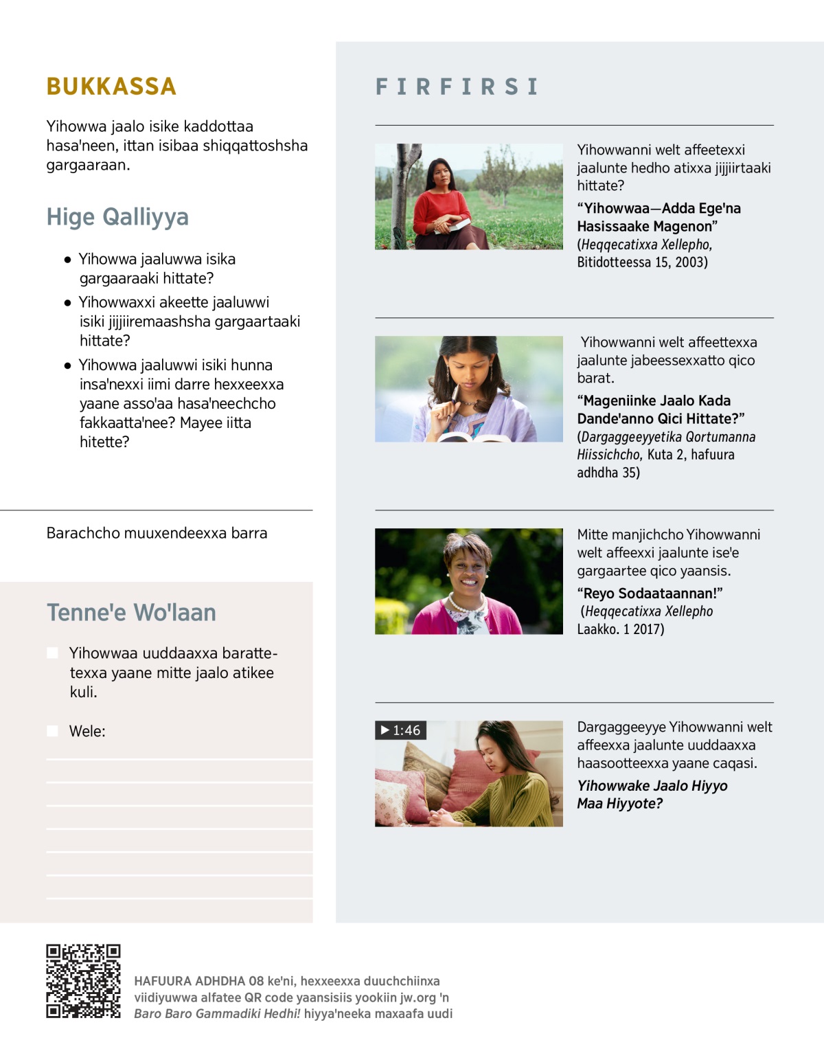 Yihowwa isoo adda egendottaa hasaꞌneen. Mayee? Buutotinna isixxa ayyunte, ora isika, ittan noꞌaa afeeka yaada egendettexxe qixxeꞌni, isike jaalo kadatee affeettexxi halcha lebbaꞌni metaaxxa egeꞌnemmaxxeeten. Dhugaandinni Yihowwake jaalo kada dandeettatto? (Faaro 25:14 yaansis.) Jaalo isike kadatee maa assa hasissa? Maxaafi Qullichchi konne qortumuwwiꞌaa hiissichcho uwwaan, ittan Yihowwan jaalo kada ayyinninna jaaloommatenaaꞌn caaldaaki hittate kaddeexxa ifisaan.