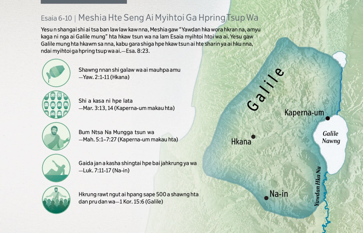 Yesu n shangai shi ai tsa ban law law kaw nna, Meshia gaw “Yawdan hka wora hkran na, amyu kaga ni nga ai Galile mung” hta hkaw tsun wa na lam Esaia myihtoi htoi wa ai. Yesu gaw Galile mung hta hkawm sa nna, kabu gara shiga hpe hkaw tsun ai hte sharin ya ai hku nna, ndai myihtoi ga hpring tsup wa ai.—Esa. 9:1, 2.