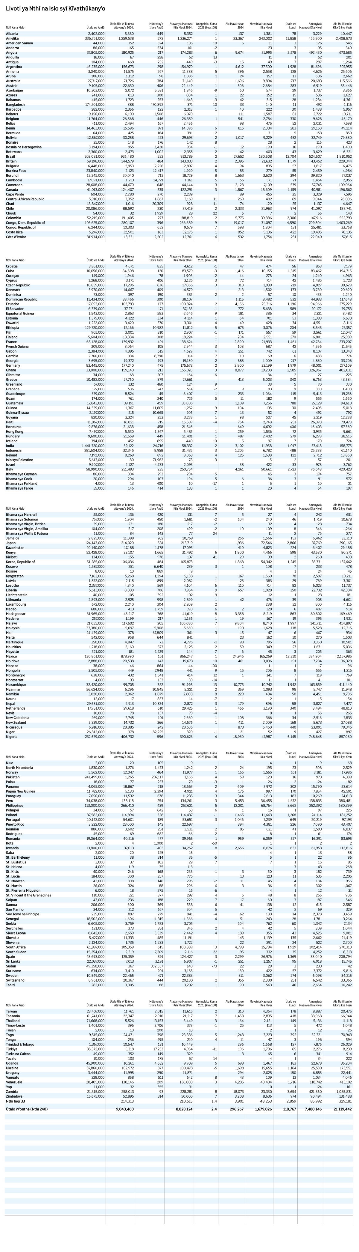| Nthĩ Kana Kĩsio | Ũtalo wa Andũ | Ũtalo Ũla wĩ Ĩũlũ wa Atavanyʼa 2024. | Mũtavanyʼa 1 kwa Andũ | Atavanyʼa Maanwʼa Kĩla Mwei 2024. | Wongeleku Kuma 2023 (kwa 100) | Ala Mavatisiwe 2024 | Mavainia Maanwʼa Kĩla Mwei | Ũtalo wa Ikundi | Amanyĩwʼa Maanwʼa Kĩla Mwei | Ala Malilikanile Kĩkwʼũ kya Yesũ |
