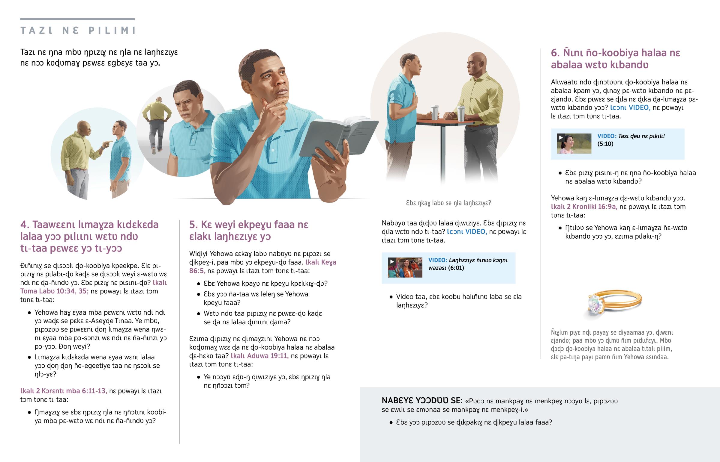 «Ɩsɔɔlɩ ɖama siŋŋ pɩlɩɩnɩ mɩ-laŋɩyɛ taa.» (1 Pɩyɛɛrɩ 1:22) Ɛzɩma ŋpɩzɩɣ nɛ ŋlabɩnɩ tʋmɩyɛ lɔŋ tasʋʋ pʋnɛ? Taaka ña-lɩmaɣza lalaa ɛjandʋ yɔɔ ɛlɛ ñɩnɩ pɛ-wɛtʋ kɩbandʋ. Taaɖʋ taabalɩyɛ nɛ mba ña nɛ wɛ ɩsɔɔlɩ wondu kʋɖʋmtʋ yɔ pe-ɖeke, ɛlɛ ñaɣ pana nɛ ŋtɩlɩ ño-koobiya halaa nɛ abalaa mba pɔ-sɔnzɩ wɛ ndɩ nɛ na-ñɩnzɩ yɔ. Pɩpɔzʋʋ ɖɔɖɔ se ɖɩla mbʋ payɩ ɖɩpɩzɩɣ yɔ nɛ ɖɩlɔ lɩmaɣza kɩdɛkɛda wena ɖɩwɛnɩ lalaa yɔɔ yɔ.—Kalɩ 1 Pɩyɛɛrɩ 2:17.a