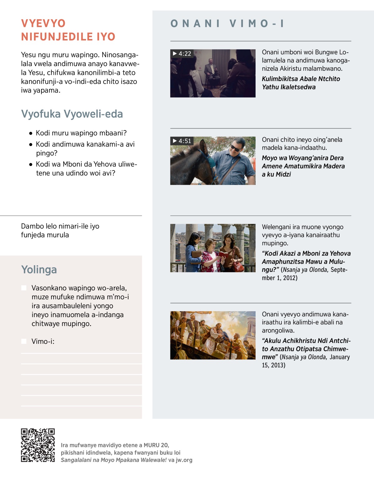 “Kiristu ngu muru wapingo.” (Aifeso 5:23) Yesu uli udimu, koma unosogolera chito ineyo athu a Yehova kanairaathu vailambo yetene yavati. Monga muru wapingo, liye usakula “kapolo wororomeleya na wazelu.” Kapolola tigulu ling’onong’ono la andimuwa anayo kanaiziweya ira Bungwe Lolamulela. (Welengani Mateyu 24:45-47.) Mofwanafwana na anamarumiwa koma teto andimuwa a wu Yerusalemu, Bungwe Lolamulela linopeleka malangizo umipingo da vailambo yetene yavati. (Vyoira 15:2) Koma athu anala kai asogoleli a gulu li-u. Ninawonga eeno chifukwa aliwa kanaroromela Yehova na mawaye ira kaasogolelenga teto kanogonjela Yesu monga muruwa.