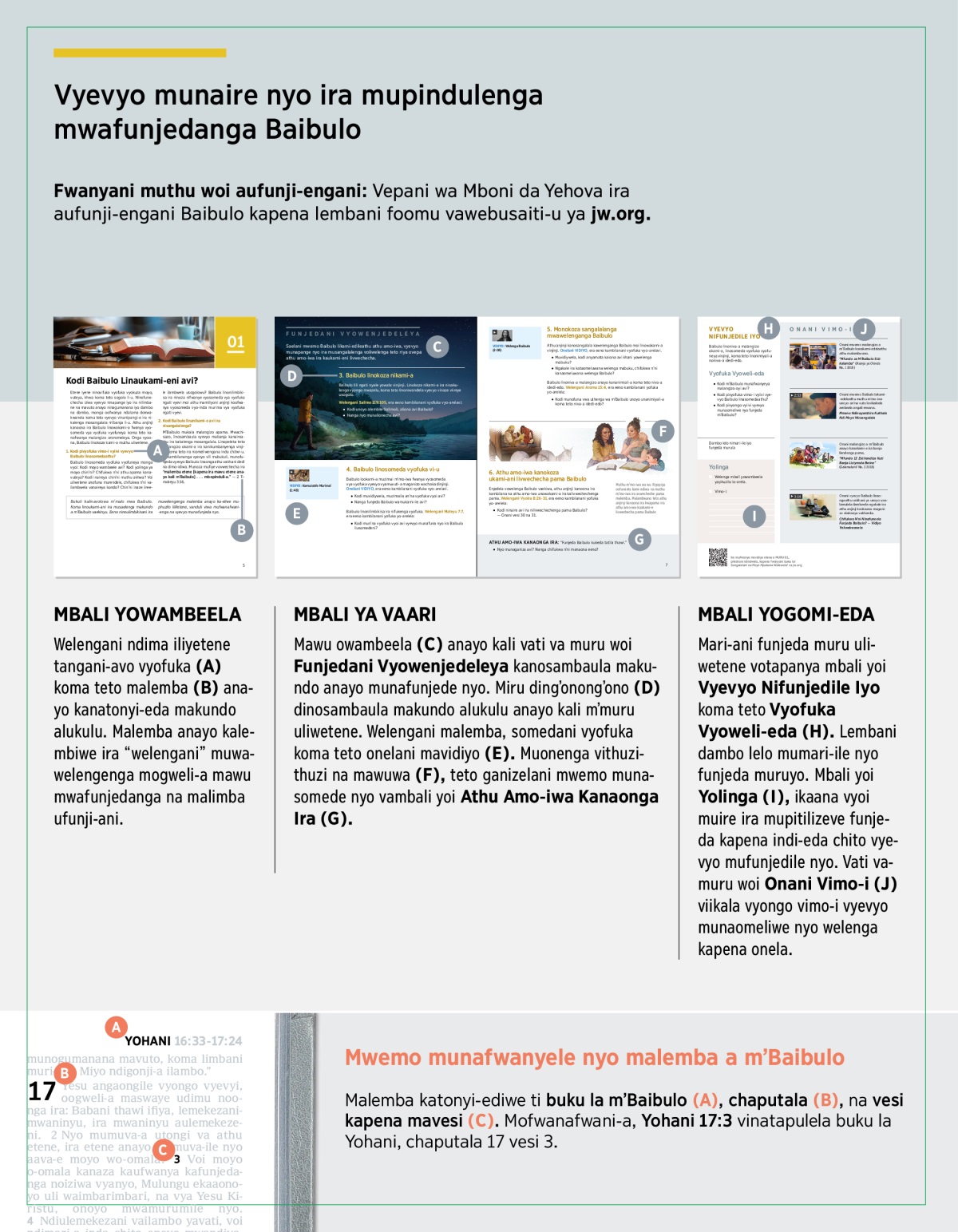 Yowambeela romoliwa ti bukhu la m’Bayibulo (A), nambala yowambeela fwanya chi chaputala (B), nambala yo-arela ti vesi vamo-i mavesi (C). Mofwanafwani-a, Yohani 17:3 vinathapulela bukhu la Yohani, chaputala 17, vesi 3.
