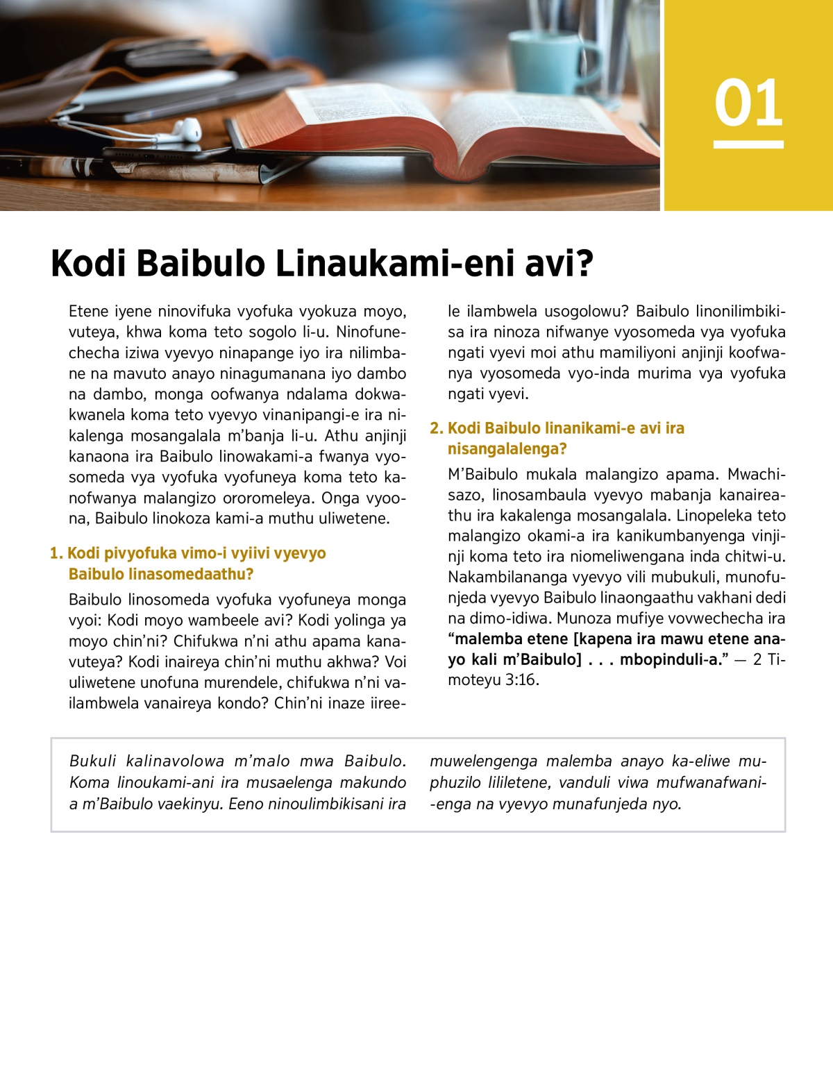 Bukhuli kalinavolowa m’malo mwa Bayibulo. Koma linoukhami-ani ira muliiziwe phama Bayibulo. Eeno vilimbi-edeni ira muwelengenga malemba a m’Bayibulo anayo kathonyi-ediwe m’bukhuli, thetho mufwanafwani-enga vyevyo Bayibulo linawongaathu na vyevyo munafunjeda nyo.