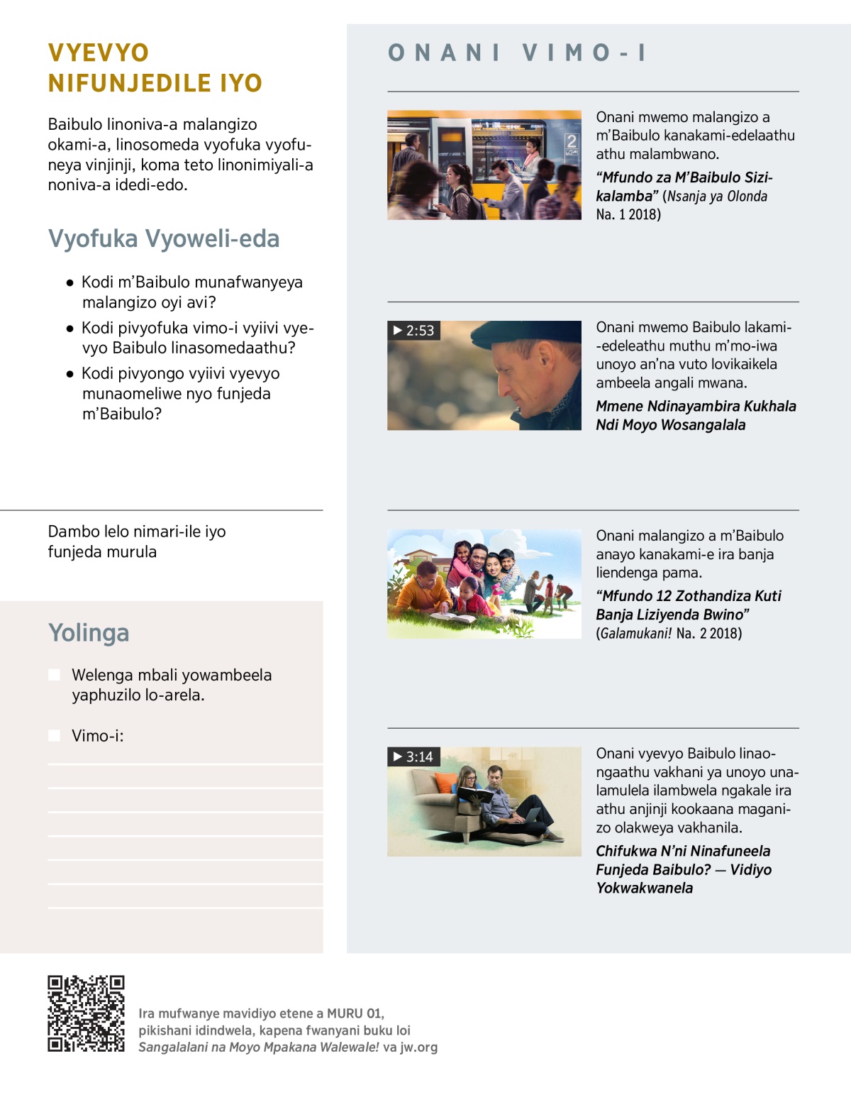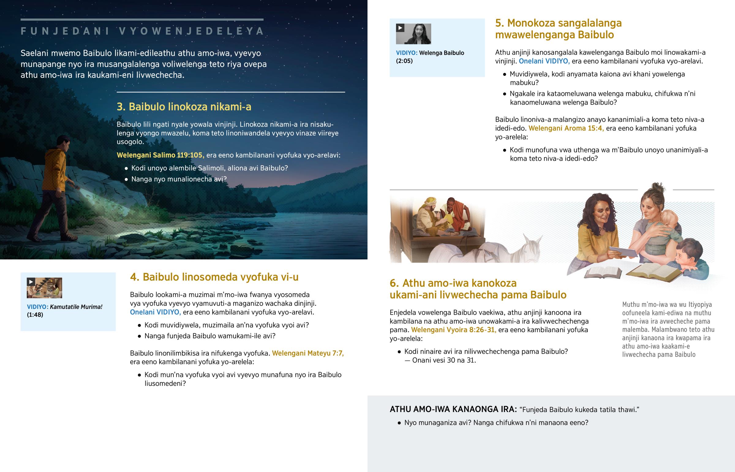 Onani mwemo Bayibulo lamukhami-edeleaathu purusori wamu-iyana m’mo-iwa fwanya vyosomeda vya vyofuka vyevyo anʼnaliye wa chaka dinjinji. Onelani VIDIYO, era eeno tapanyani vyofuka vyo-arelavi.