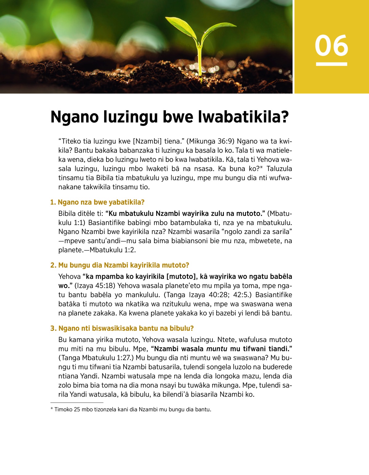 “Titeko tia luzingu kwe [Nzambi] tiena.” (Mikunga 36:9) Ngano wa ta kwikila? Bantu bakaka babanzaka ti luzingu ka basala lo ko. Tala ti wa matieleka wena, dieka bo luzingu lweto ni bo kwa lwabatikila. Kâ, tala ti Yehova wasala luzingu, luzingu mbo lwaketi bâ na nsasa. Ka buna ko?a Taluzula tinsamu tia Bibila tia mbatukulu ya luzingu, mpe mu bungu dia nti wufwanakane takwikila tinsamu tio.