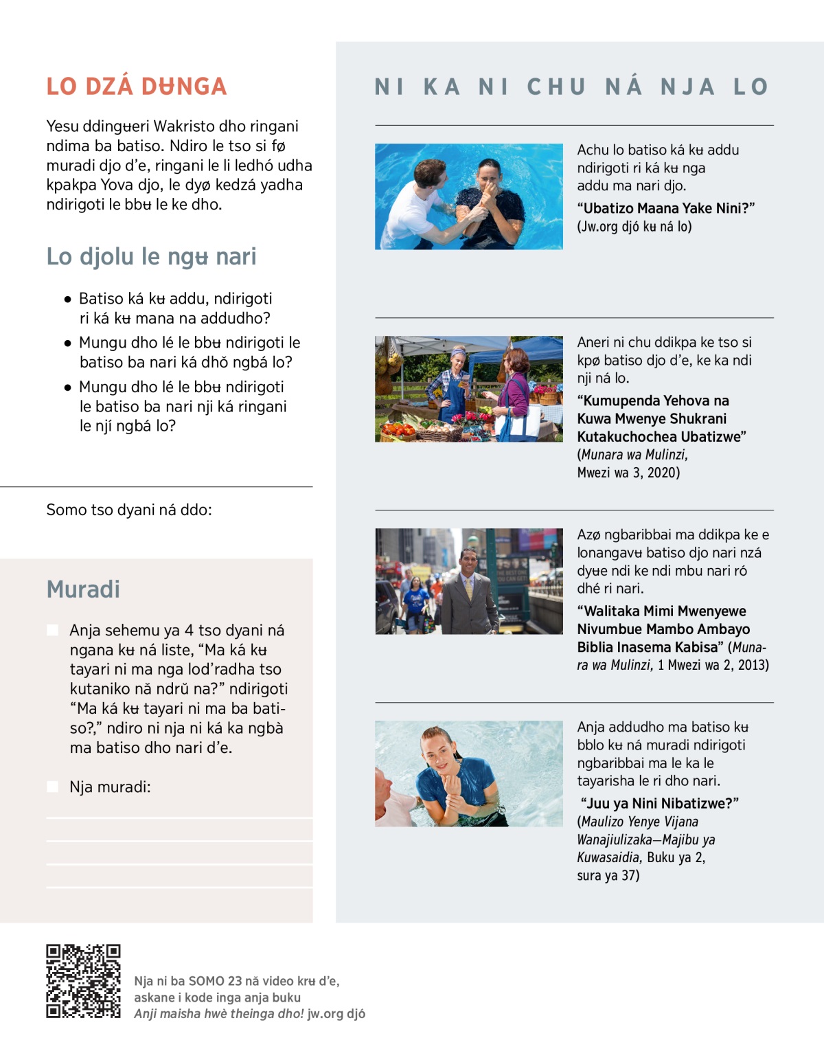 Batiso ddikpa le ba nari na, le ridho ndi jiri ndi bbʉ ndi Yova Mungu dho. Ddikpa le ká ka ndi bbʉ ndi Mungu dho ngbaribbai? Batiso lé ba nari nji, ddiro le nji ná sala nǎ, lé adi ripo Yova dho le jiri le njínji ke dho ledhó maisha lu nǎ. Le adi tsoni le bbʉ madha Yova ddiro dho dhé ndirigoti ke ji nari le nji nari sie bbo na mana kʉ ná lo ledhó maisha nǎ. Le adi rivʉ “le gʉ le leléro . . . ndiro le dyø” Yesu dhó mafundisho ndirigoti kedhó loroji d’e. (Matayo 16:24) Yova dho le bbʉ le ndirigoti le ba batiso nari ka ndi liri le kana kau e chøchø Yova na ndirigoti nja Wakristo mana.