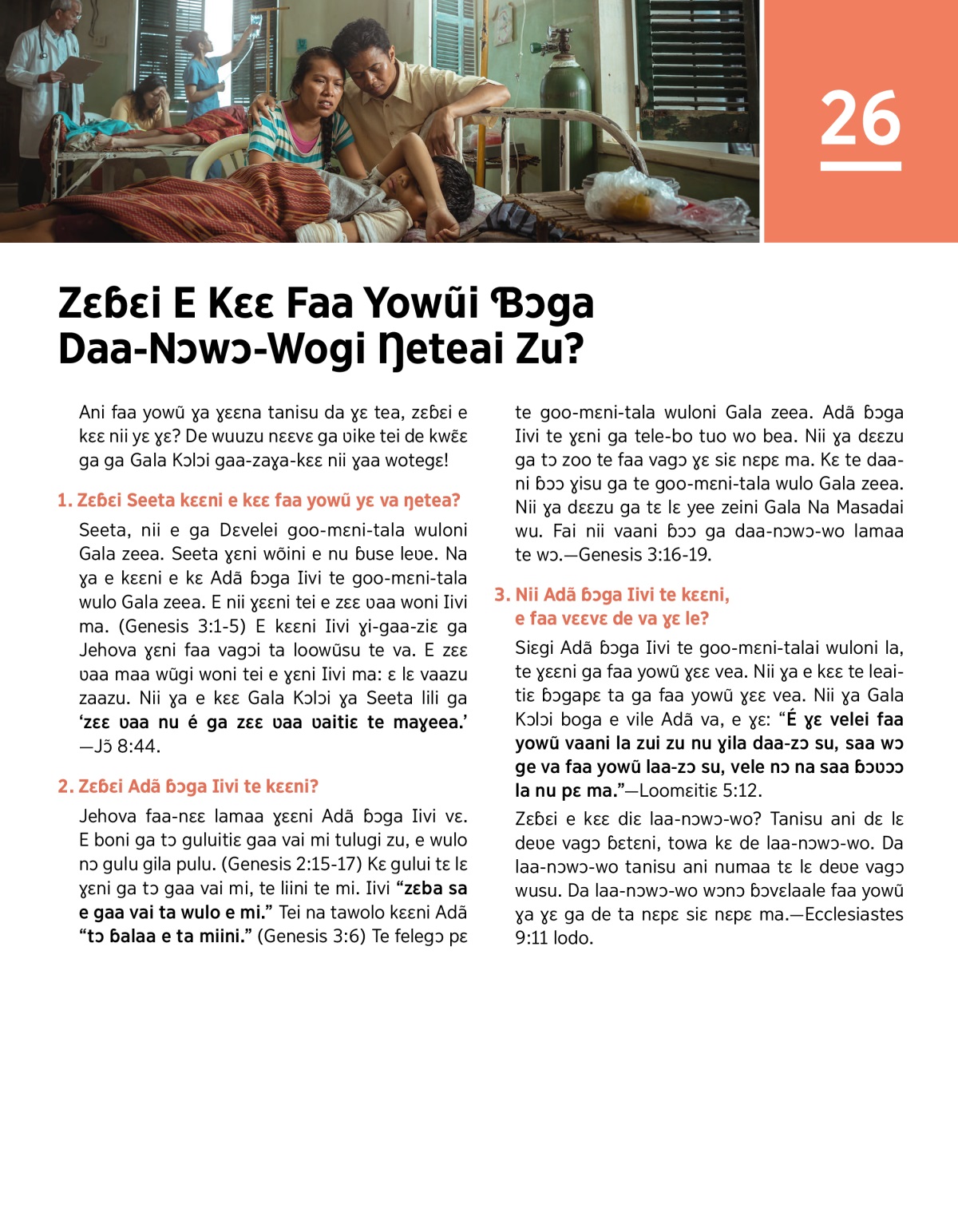 Jehova faa-nɛɛ lamaa ɣɛɛni Adã ɓɔga Iivi vɛ. E boni ga tɔ guluitiɛ gaa vai mi tulugi zu, e wulo nɔ gulu gila pulu. (Genesis 2:15-17) Kɛ gului tɛ lɛ ɣɛni ga tɔ gaa vai mi, te liini te mi. Iivi “zɛba sa e gaa vai ta wulo e mi.” Tei na tawolo kɛɛni Adã “tɔ ɓalaa e ta miini.” (Genesis 3:6) Te felegɔ pɛ te goo-mɛni-tala wuloni Gala zeea. Adã ɓɔga Iivi te ɣɛni ga tele-bo tuo wo bea. Nii ɣa dɛɛzu ga tɔ zoo te faa vagɔ ɣɛ siɛ nɛpɛ ma. Kɛ te daani ɓɔɔ ɣisu ga te goo-mɛni-tala wulo Gala zeea. Nii ɣa dɛɛzu ga tɛ lɛ yee zeini Gala Na Masadai wu. Fai nii vaani ɓɔɔ ga daa-nɔwɔ-wo lamaa te wɔ.—Genesis 3:16-19.