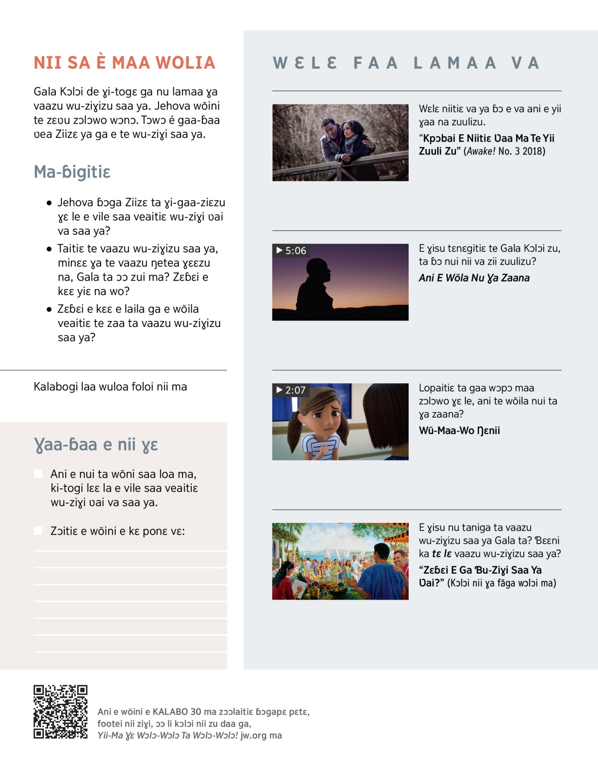 Sai ɣa va ga zii zuuli ɓakpa de wɔ, e kɛ de maa wõi. Na ɣa e kɛɛ Gala Kɔlɔi ɣa sai lili ga de wɔ̀ɔ yɔ̃wɔi. (1 Kɔlĩitiɛ 15:26) Kalabo 27 zu, de maa wolini ga Jehova ɣa vaazu de wɔ̀ɔ yɔ̃wɔi nii yee maazu ɣale zu. Kɛ zɛɓɛi sa e vaazu ɣɛɛzu ga niitiɛ te zaa? Kalabogi nii zu, ya vaazu wɔnɔ faa maa wolizu e vile ki-togi nii va Jehova fea de ya—tɔ vaazu nu lamaa wu-ziɣizu saa ya ga te yii-ma ɣɛ wɔlɔ-wɔlɔ ta wɔlɔ-wɔlɔ. E ɣisu nii ɣa vaazu ɣɛɛzu? E ɣisu ta vaazu wu-ziɣizu ga te ŋetea ɣɛ Gala ta ɔɔ zui ma?