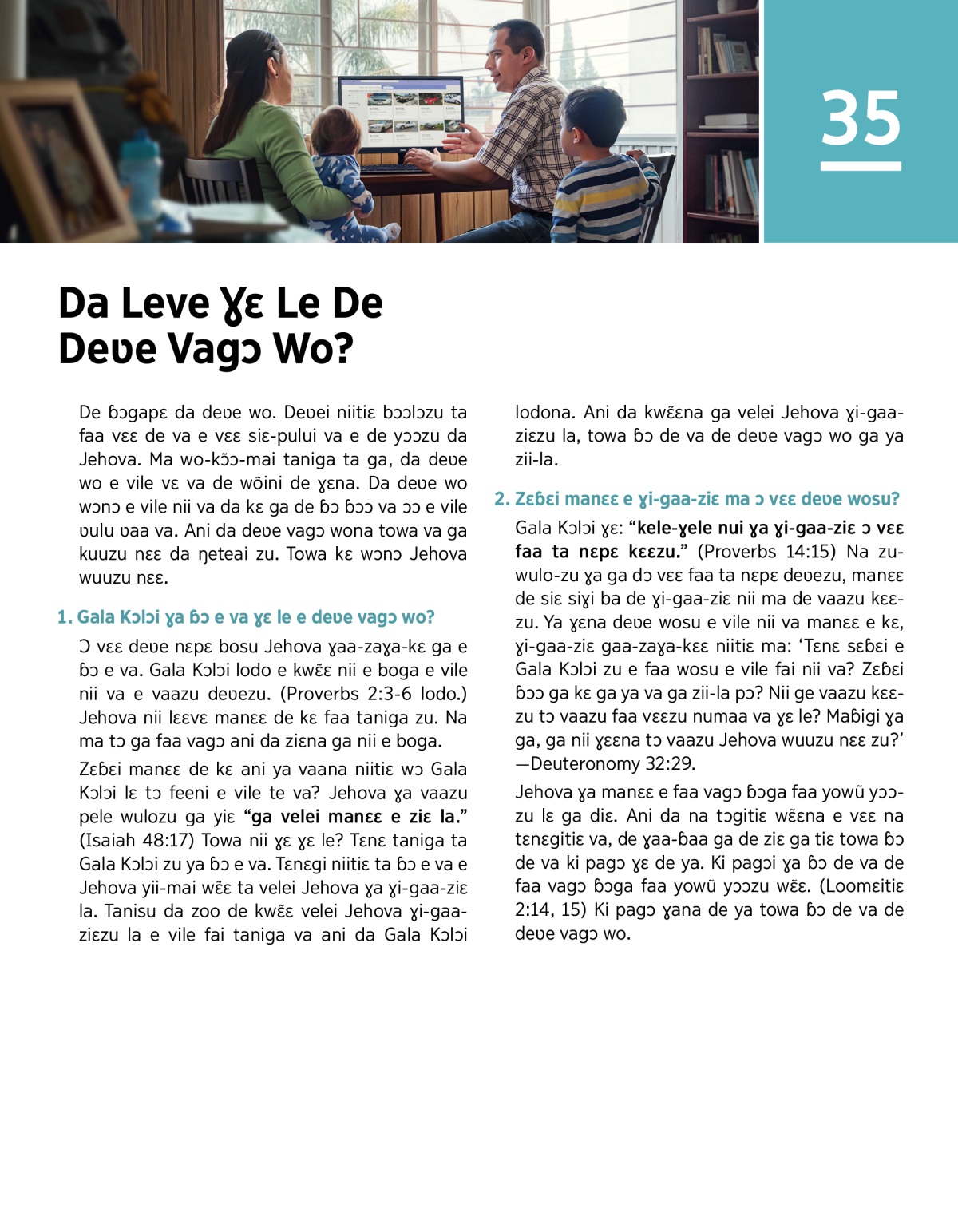Gala Kɔlɔi ɣɛ: “kele-ɣele nui ɣa ɣi-gaa-ziɛ ɔ vɛɛ faa ta nɛpɛ kɛɛzu.” (Proverbs 14:15) Na zu-wulo-zu ɣa ga dɔ vɛɛ faa ta nɛpɛ deʋezu, manɛɛ de siɛ siɣi ba de ɣi-gaa-ziɛ nii ma de vaazu kɛɛzu. Ya ɣɛna deʋe wosu e vile nii va manɛɛ e kɛ, ɣi-gaa-ziɛ gaa-zaɣa-kɛɛ niitiɛ ma: ‘Tɛnɛ sɛɓɛi e Gala Kɔlɔi zu e faa wosu e vile fai nii va? Zɛɓɛi ɓɔɔ ga kɛ ga ya va ga zii-la pɔ? Nii ge vaazu kɛɛzu tɔ vaazu faa vɛɛzu numaa va ɣɛ le? Maɓigi ɣa ga, ga nii ɣɛɛna tɔ vaazu Jehova wuuzu nɛɛ zu?’—Deuteronomy 32:29.