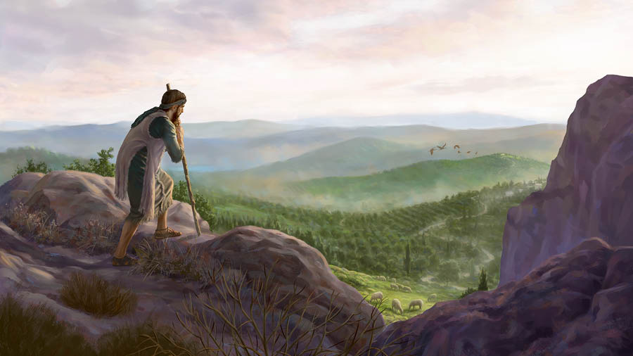 d PICTURE DESCRIPTION: The wayward son, worn out after a long journey, is relieved when he finally sees his home in the distance.