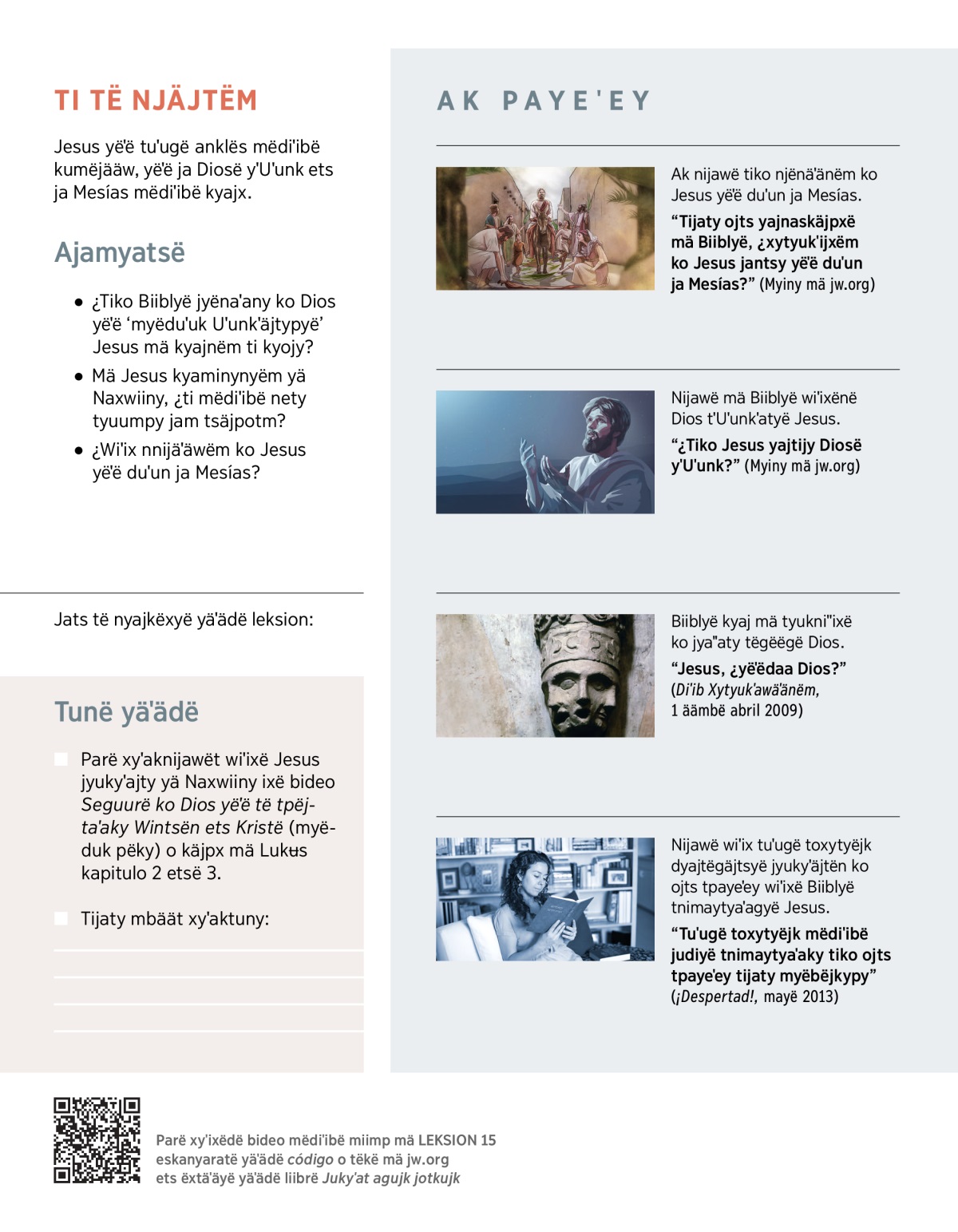 Jesus yëˈë yaˈˈawats ja nëˈë tuˈu parë jatëgok nmëwingoˈonëmë Dios ets tukniˈˈijxë ja tëyˈäjtën mä pënën Jyobaa. Mët yëˈëgyëjxm, nbäädäˈänëm ja jukyˈäjtënë winë xëëbë.