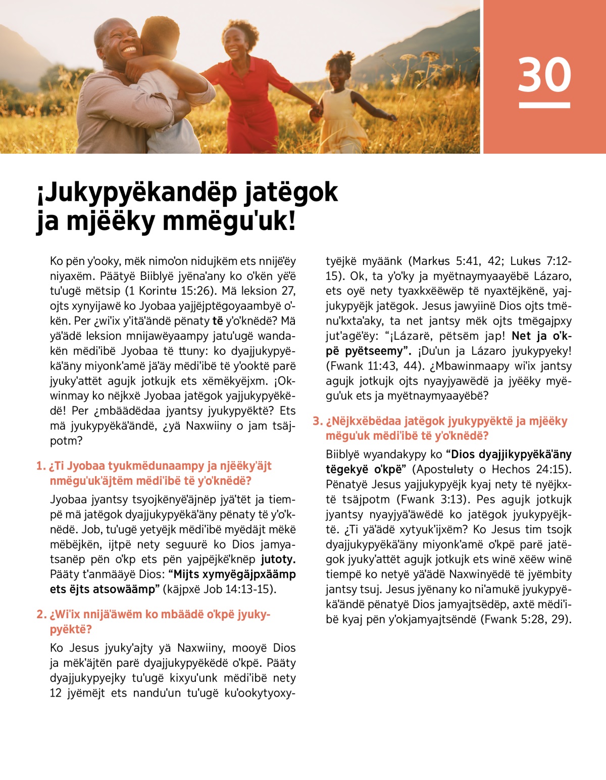 Ko pën yˈooky, mëk nimoˈon nidujkëm ets nnijëˈëy niyaxëm. Päätyë Biiblyë jyënaˈany ko oˈkën yëˈë tuˈugë mëtsip (1 Korintʉ 15:26). Mä leksion 27, ojts xynyijawë ko Jyobaa yajjëjptëgoyaambyë oˈkën. Per ¿wiˈix yˈitäˈändë pënaty të yˈoˈknëdë? Mä yäˈädë leksion mnijawëyaampy jatuˈugë wandakën mëdiˈibë Jyobaa të ttuny: ko dyajjukypyëkäˈäny miyonkˈamë jäˈäy mëdiˈibë të yˈooktë parë jyukyˈattët agujk jotkujk ets xëmëkyëjxm. ¡Okwinmay ko nëjkxë Jyobaa jatëgok yajjukypyëkëdë! Per ¿mbäädëdaa jyantsy jyukypyëktë? Ets mä jyukypyëkäˈändë, ¿yä Naxwiiny o jam tsäjpotm?