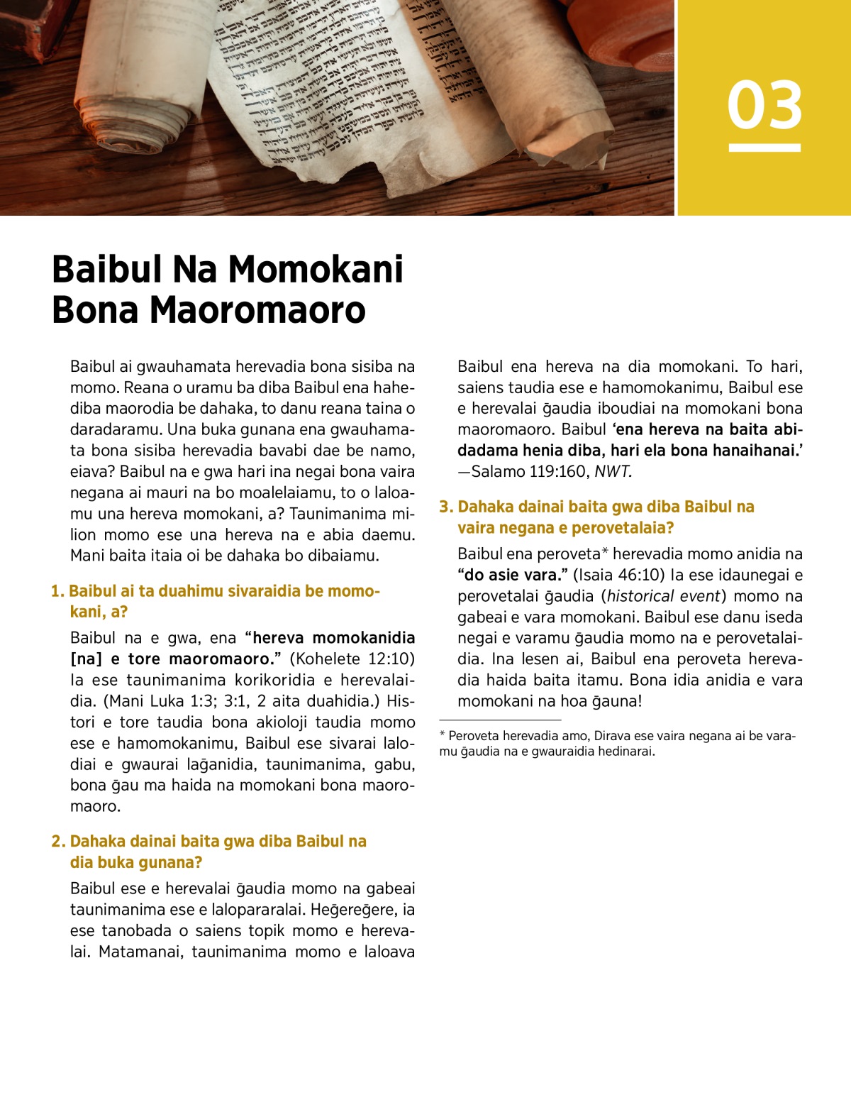 Baibul ai gwauhamata herevadia bona sisiba na momo. Reana o uramu ba diba Baibul ena hahediba maorodia be dahaka, to danu reana taina o daradaramu. Una buka gunana ena gwauhamata bona sisiba herevadia bavabi dae be namo, eiava? Baibul na e gwa hari ina negai bona vaira negana ai mauri na bo moalelaiamu, to o laloamu una hereva momokani, a? Taunimanima milion momo ese una hereva na e abia daemu. Mani baita itaia oi be dahaka bo dibaiamu.
