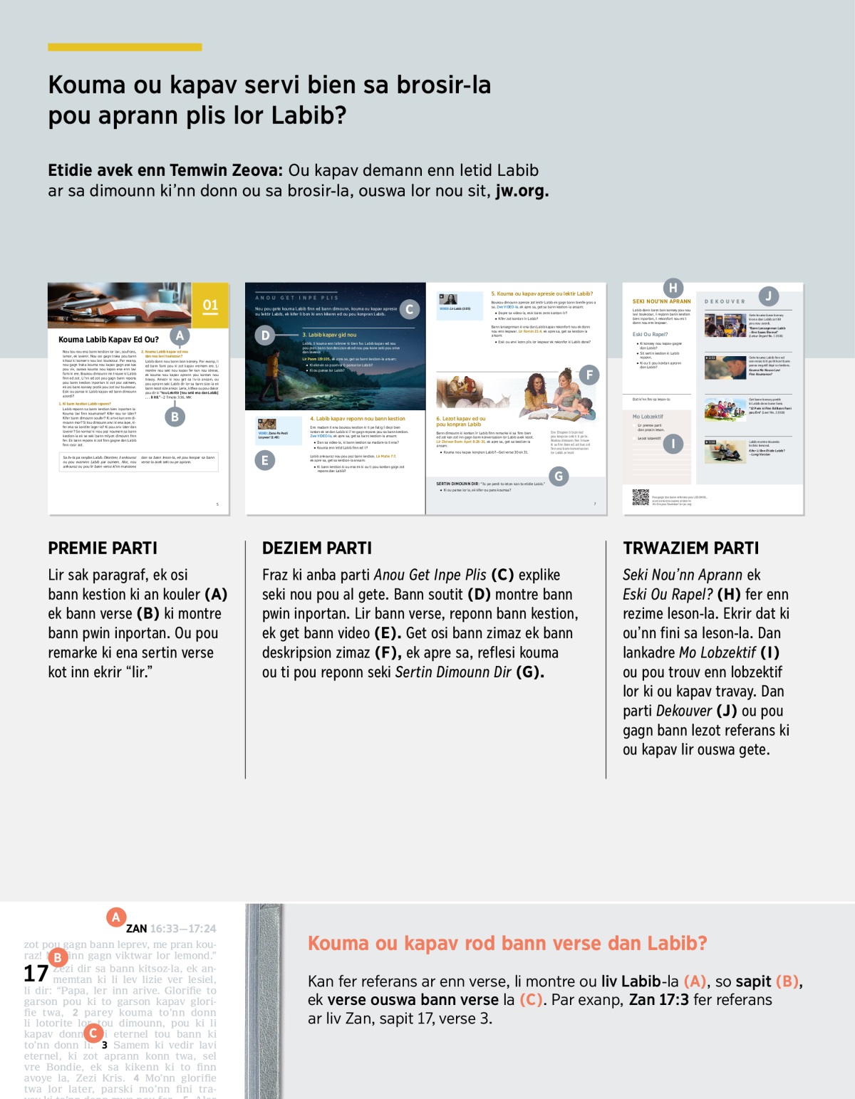 Etidie avek enn Temwin Zeova: Ou kapav demann enn letid Labib ar sa dimounn ki’nn donn ou sa brosir-la, ouswa lor nou sit, jw.org.